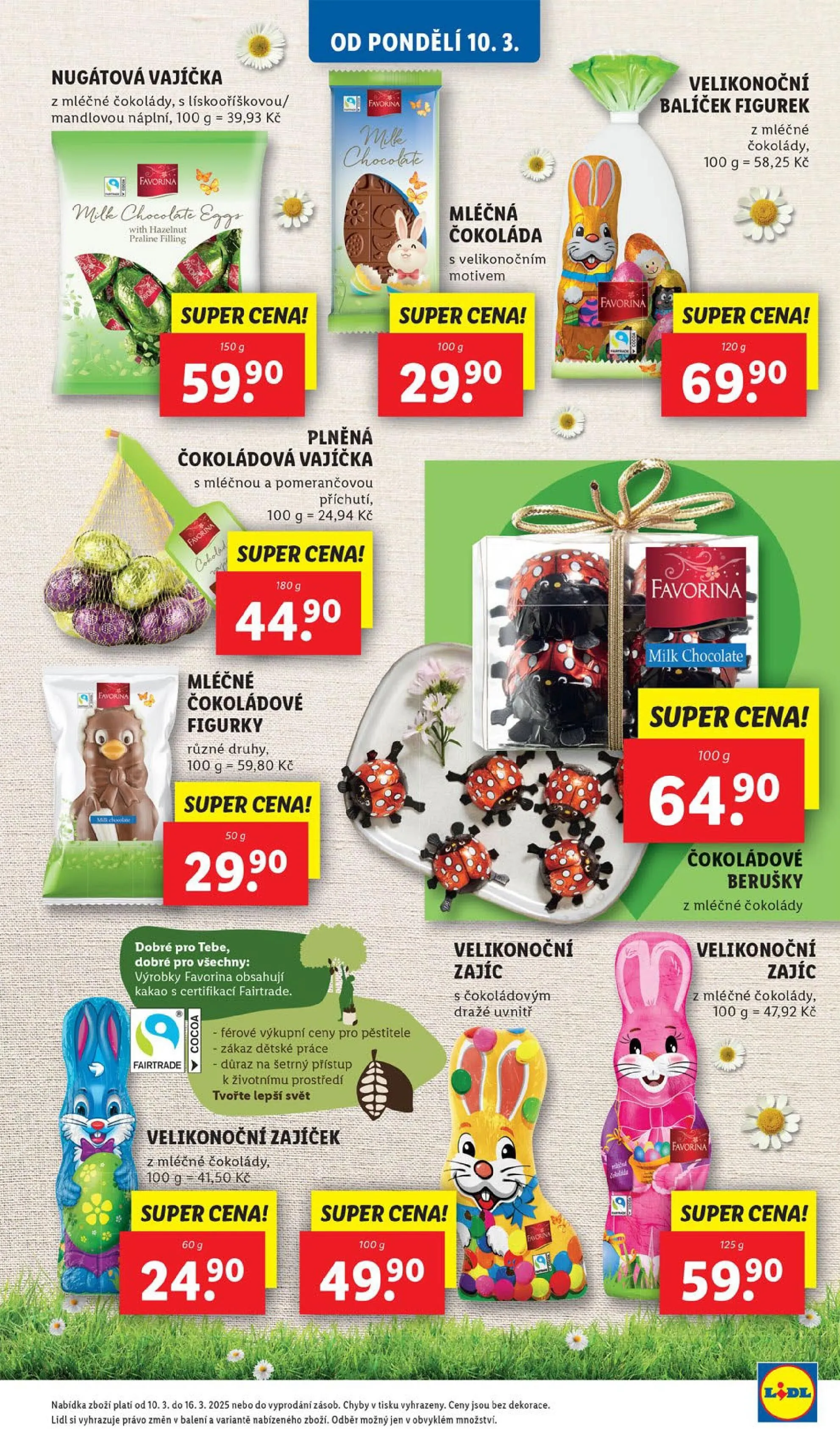 V letáku obchodu Lidl najdete skvělou nabídku velikonočních sladkostí! Mezi nimi jsou nugátová vajíčka z mléčné čokolády s lískooříškovou nebo mandlovou náplní za super cenu 39,93 Kč. Dále si můžete pořídit mléčnou čokoládu s velikonočním motivem za 29,90 Kč. Plněná čokoládová vajíčka s mléčnou a pomerančovou příchutí jsou k dostání za 24,94 Kč. Nezapomeňte také na mléčné čokoládové figurky různých druhů za 59,80 Kč.