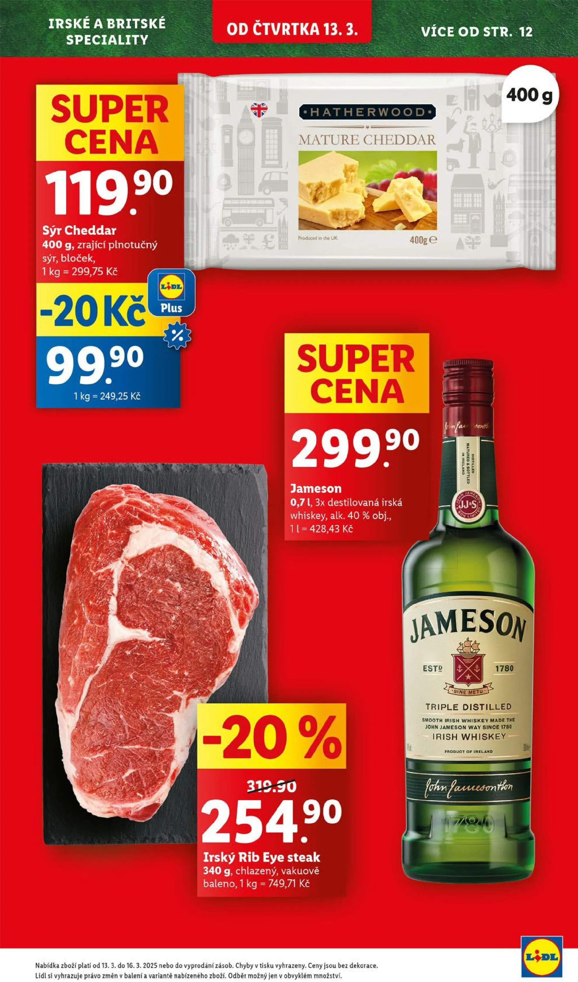 V letáku obchodu Lidl najdete skvělé irské a britské speciality za super ceny! Mezi nabízenými produkty se nachází zrající plnotučný sýr Cheddar (400 g) za cenu 299,75 Kč/kg a Hatherwood Mature Cheddar (400 g) za 249,25 Kč/kg. Milovníci whiskey si mohou vychutnat irskou whiskey Jameson (0,7 l) za 1 428,43 Kč. Nezapomeňte také na irský rib eye steak (340 g), který je chlazený a vakuově balený, za cenu 749,71 Kč/kg. Tato nabídka platí od 13.3. do 16.3.2025 nebo do vyprodání zásob. Ceny jsou bez dekorace a Lidl si vyhrazuje právo na změny v balení a variantách nabízeného zboží.