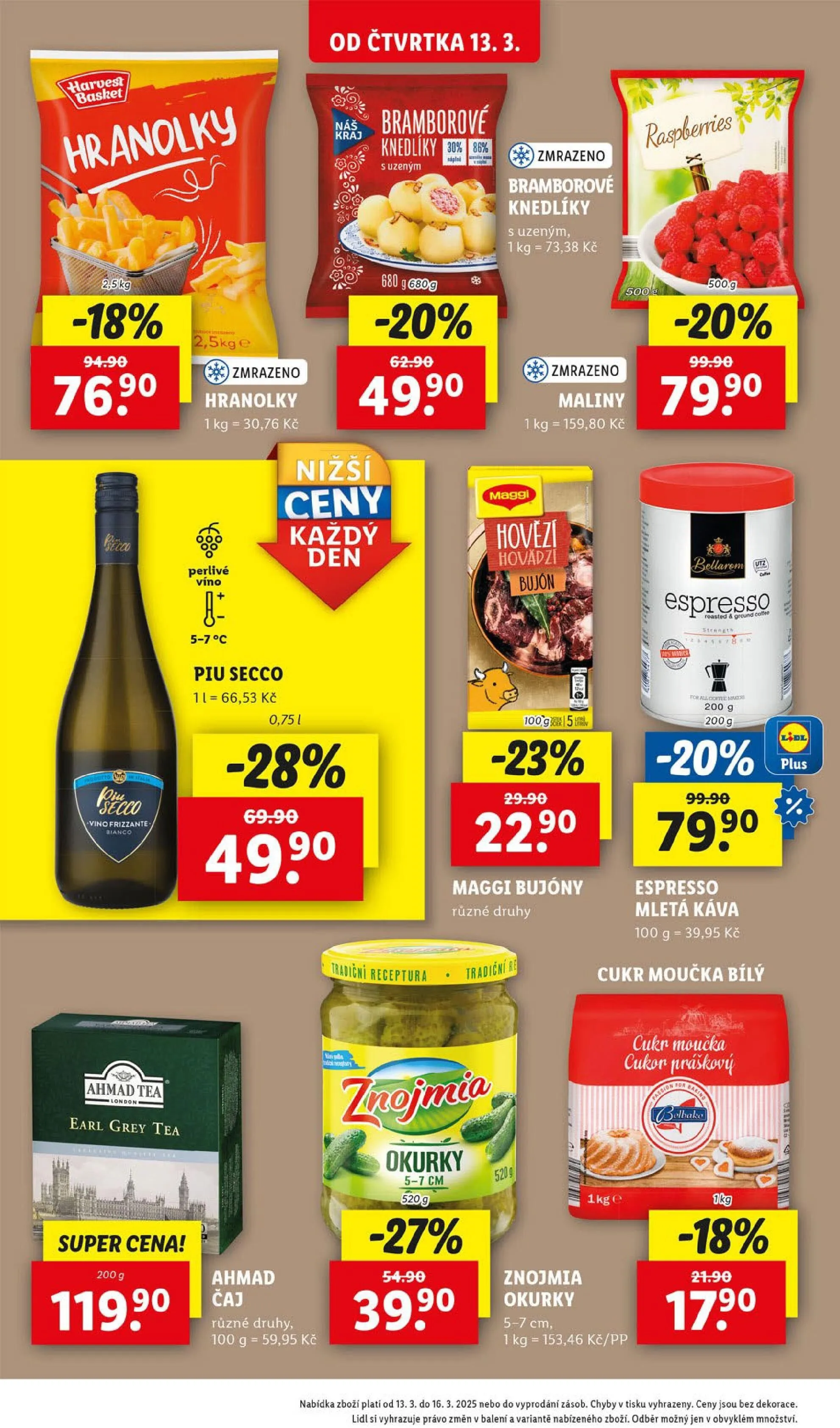 Od čtvrtka 13.3. v Lidlu najdete skvělé akční nabídky! Zmrazené bramborové knedlíky s uzeným jsou nyní se slevou -20% za 49,90 Kč. Také si můžete dopřát zmrazené hranolky za 30,76 Kč za kilogram. Pro milovníky ovoce máme zmrazené maliny, které jsou cenově dostupné.