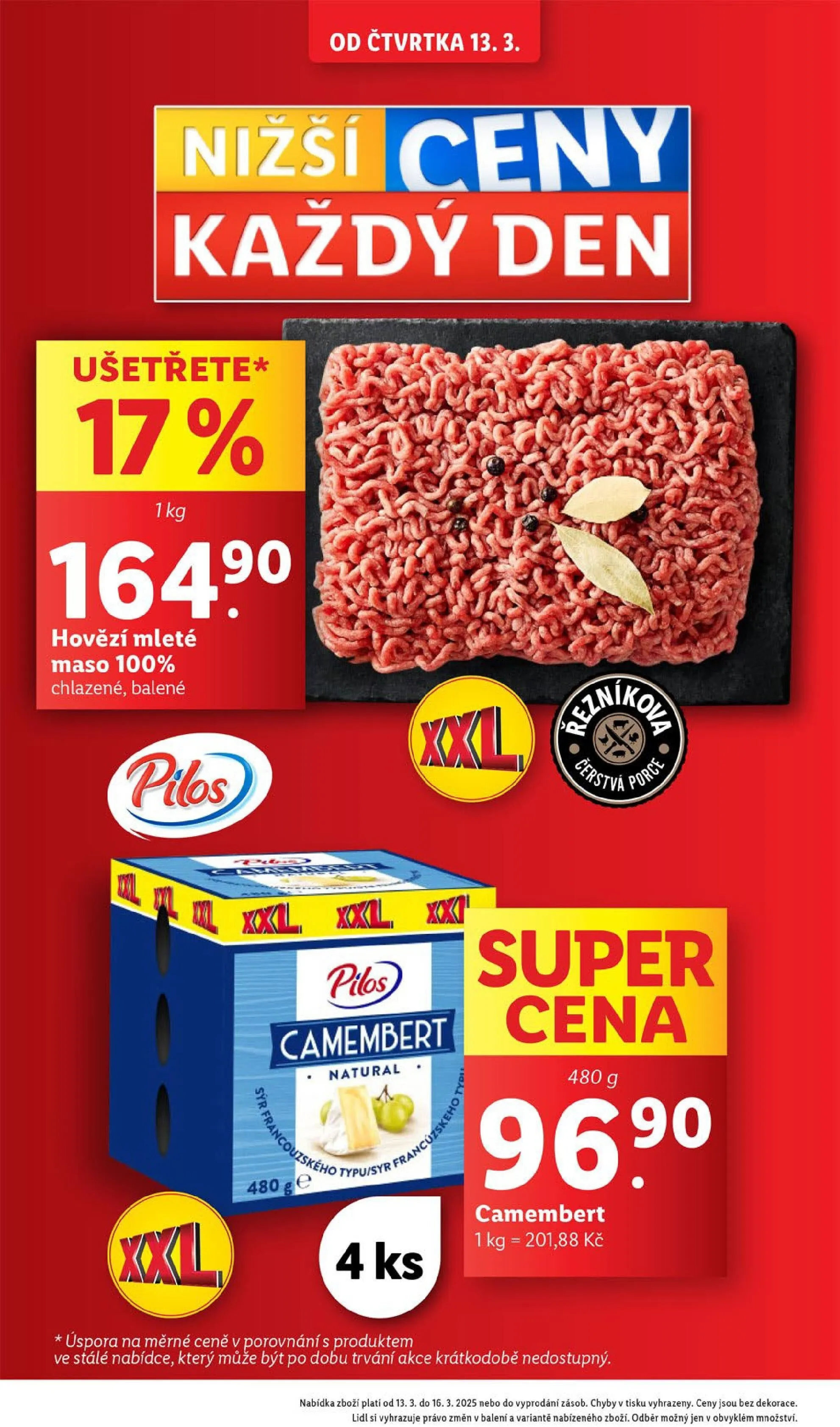 Od čtvrtka 13.3. si můžete v Lidlu užít skvělé akce! Ušetřete na 100% hovězím mletém mase, které je chlazené a balené. Cena za 480 g je 96,90 Kč. Dále nabízíme lahodný camembert, který je k dostání za 201,88 Kč za 1 kg. Nezapomeňte, že nabídka platí od 13.3. do 16.3.2025 nebo do vyprodání zásob. Těšíme se na vaši návštěvu!