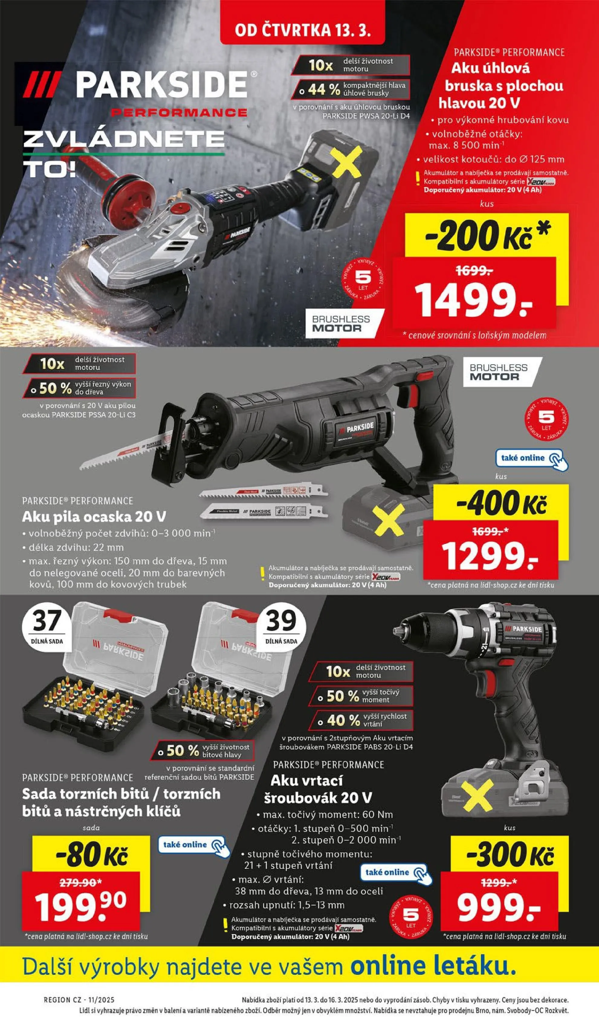 Od čtvrtka 13.3. v obchodě Lidl najdete skvělou nabídku produktů značky Parkside. Mezi nimi je aku pila ocaska 20 V, která nabízí volnoběžný počet zdvihů až 3 000/min a maximální řezný výkon do dřeva 150 mm. Dále si můžete pořídit aku úhlovou brusku s plochou hlavou, ideální pro hrubování kovu, s maximálními otáčkami 8 500/min.
