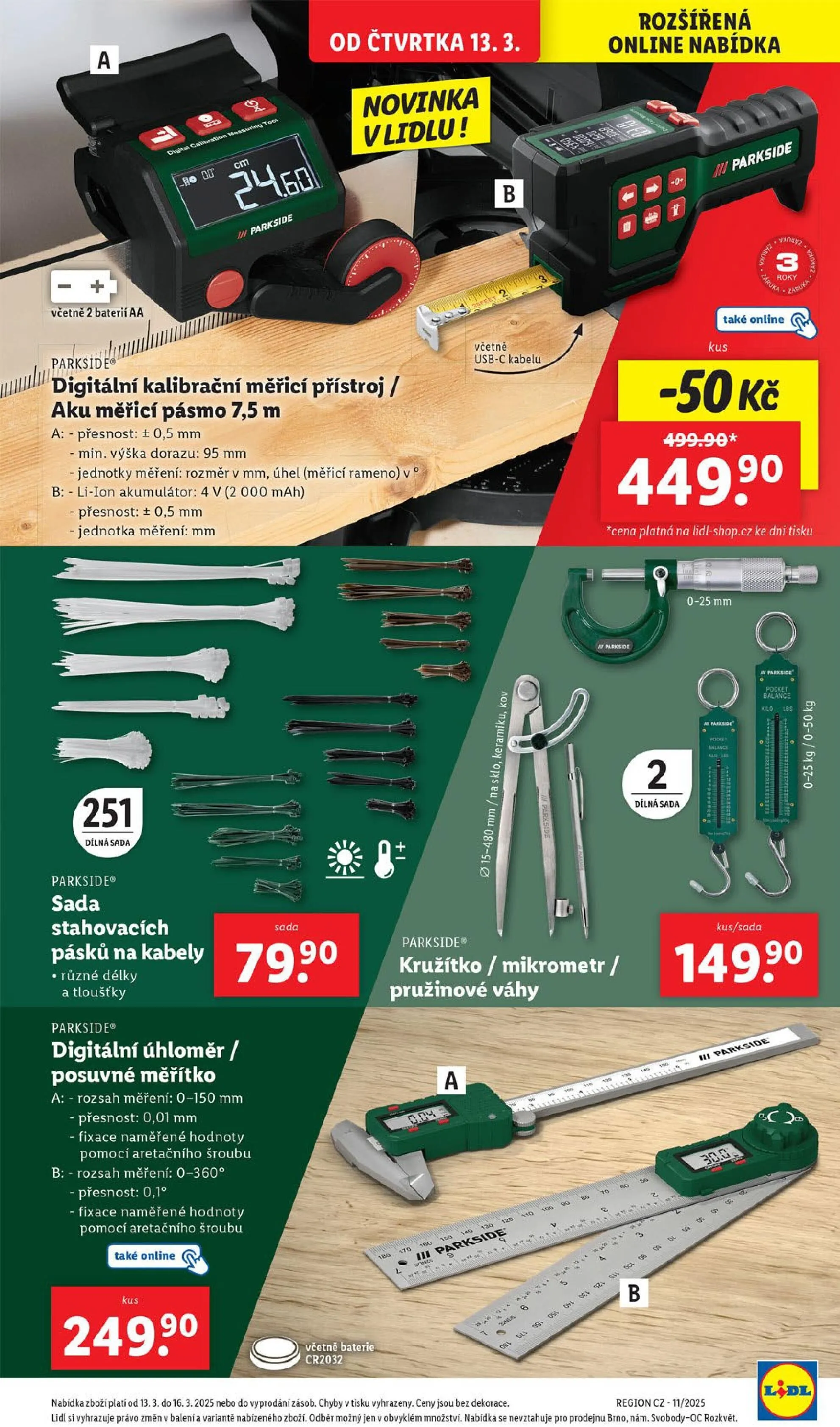 V letáku obchodu Lidl najdete skvělou nabídku nových produktů, které potěší každého kutila. Od čtvrtka 13.3. si můžete pořídit aku měřicí pásmo s délkou 7,5 m, které zahrnuje 2 AA baterie a USB-C kabel. Tento přístroj nabízí přesnost 0,5 mm a minimální výšku dorazu 95 mm.