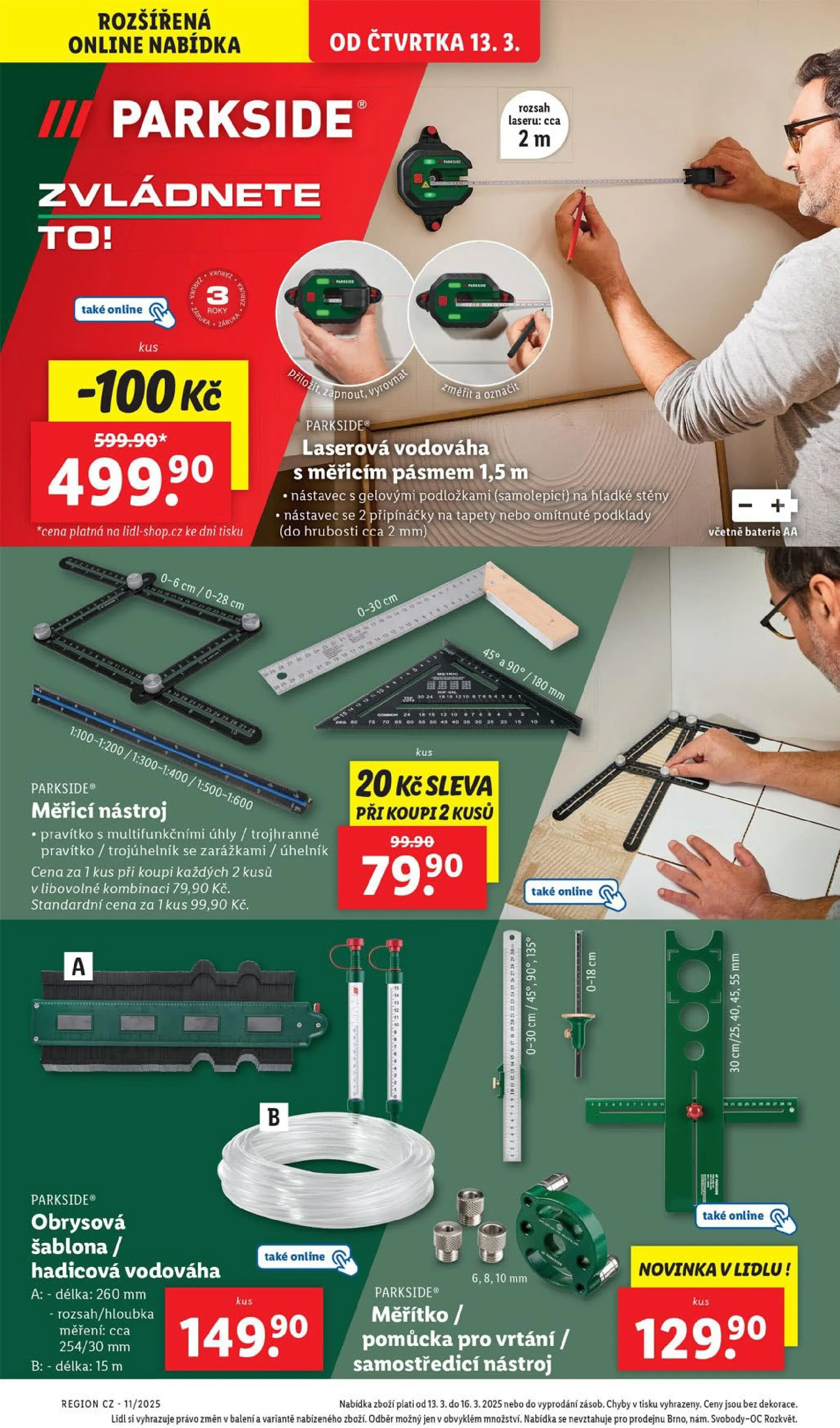 V letáku obchodu Lidl najdete širokou nabídku produktů, které potěší každého kutila. Od čtvrtka 13.3. si můžete pořídit laserovou vodováhu s nástavci pro snadné měření na různých typech povrchů. K dispozici je také pravítko s multifunkčními úhly a trojúhelník se zarážkami, které usnadní práci při řezání a měření. Nezapomeňte na hadicovou vodováhu, ideální pro přesné měření. Všechny produkty jsou dostupné online a v akci, takže neváhejte a využijte skvělé ceny. Nabídka platí do 16.3.2025 nebo do vyprodání zásob.