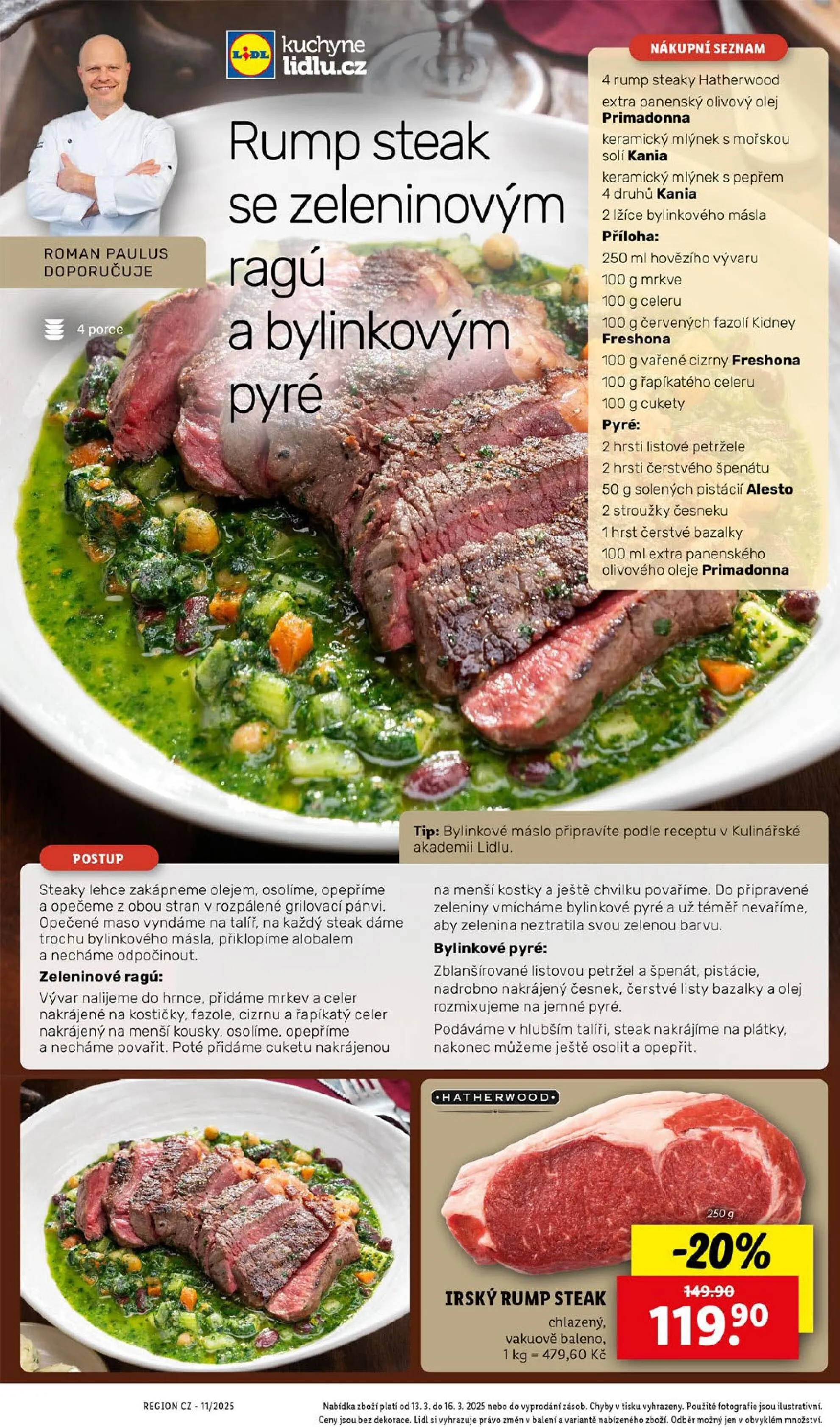 V letáku obchodu Lidl najdete skvělou nabídku na irský rump steak, který je chlazený a vakuově balený. Tento kvalitní kus masa je ideální pro přípravu lahodného jídla s bylinkovým pyré a zeleninovým ragú. Doporučujeme zakoupit 4 rump steaky značky Hatherwood, které můžete lehce osolit, opepřit a opéct na grilovací pánvi. K tomu si připravte chutné ragú z mrkve, celeru, fazolí a cizrny, které skvěle doplní bylinkové pyré z čerstvých bylinek a pistácií. Nezapomeňte na extra panenský olivový olej a keramické mlýnky na sůl a pepř pro dokonalou chuť. Využijte akční nabídku a užijte si skvělý gastronomický zážitek!