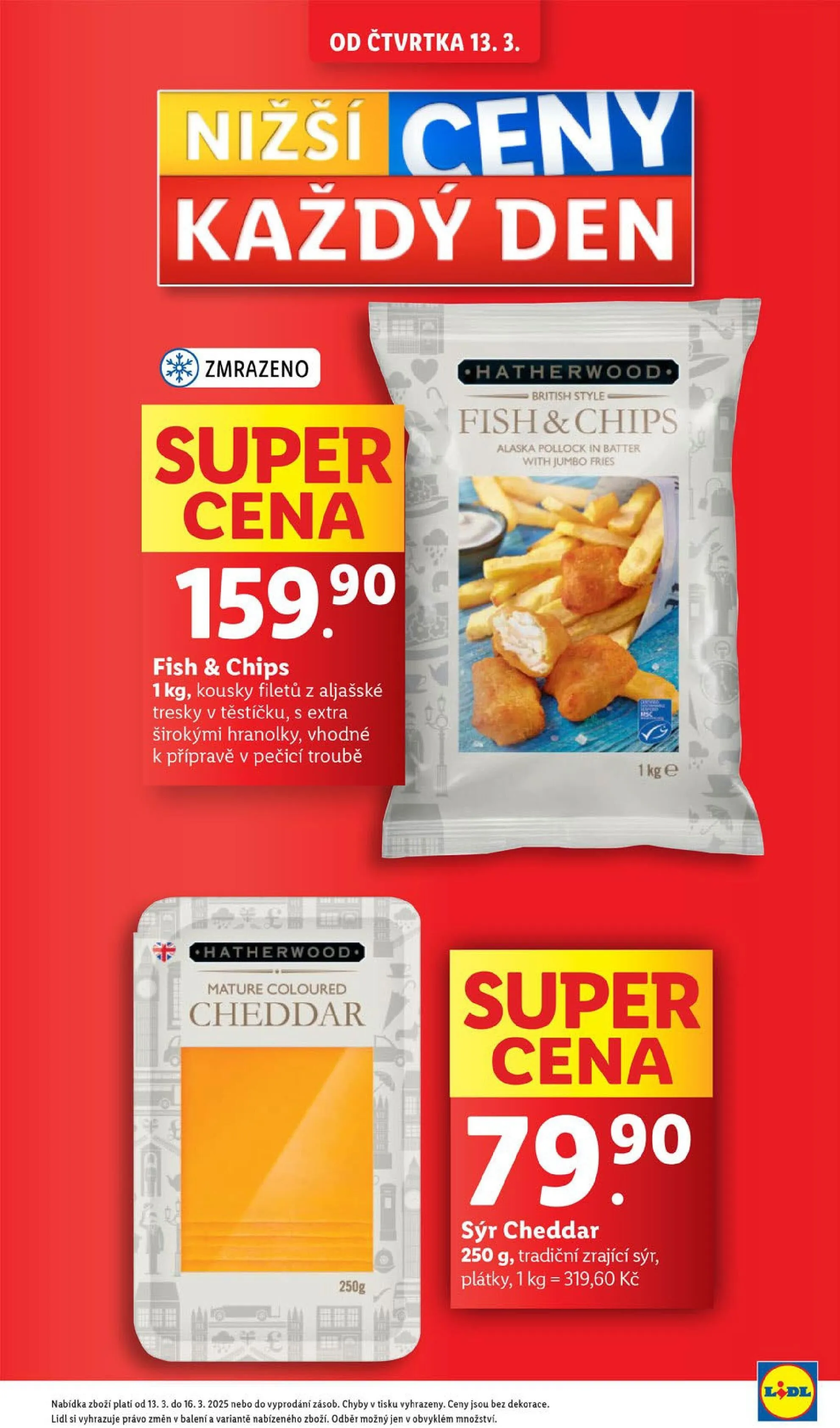 Od čtvrtka 13.3. v Lidlu najdete skvělé nabídky! V akci je zmrazené fish & chips, 1 kg kousků filetů z aljašské tresky v těstíčku s extra širokými hranolky, ideální k přípravě v pečicí troubě. Dále nabízíme tradiční zrající sýr cheddar, 250 g plátky, s cenou 1 kg = 319,60 Kč. Tato nabídka platí od 13.3. do 16.3.2025 nebo do vyprodání zásob. Nezapomeňte, že ceny jsou bez dekorace a Lidl si vyhrazuje právo na změny v balení a variantách nabízeného zboží.