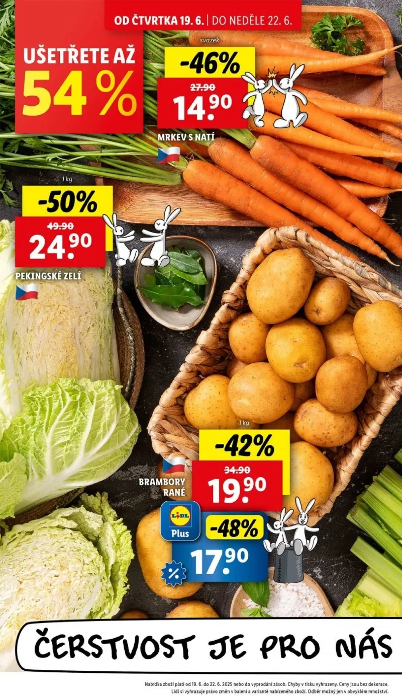 Od čtvrtka 19.6. do neděle 22.6. máte jedinečnou příležitost ušetřit až 50% na vybraných produktech v obchodě Lidl. V nabídce najdete čerstvé pekingské zelí za skvělou cenu, svazek mrkve Sna a rané brambory, které jsou také výrazně zlevněny. Nezapomeňte, že tato akční nabídka platí od 19.6. do 21.6.2025, nebo do vyprodání zásob. Přijďte si pro čerstvost a kvalitu za výhodné ceny!