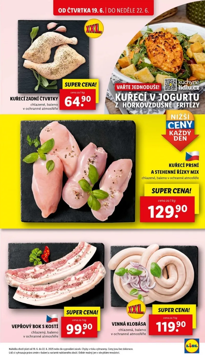 Od čtvrtka 19.6. do neděle 22.6. si nenechte ujít skvělé nabídky v Lidlu! V akci jsou kuřecí zadní čtvrtky chlazené, balené v ochranné atmosféře, a vepřový bok s kostí, také chlazený a balený v ochranné atmosféře. Oba produkty jsou za super ceny!