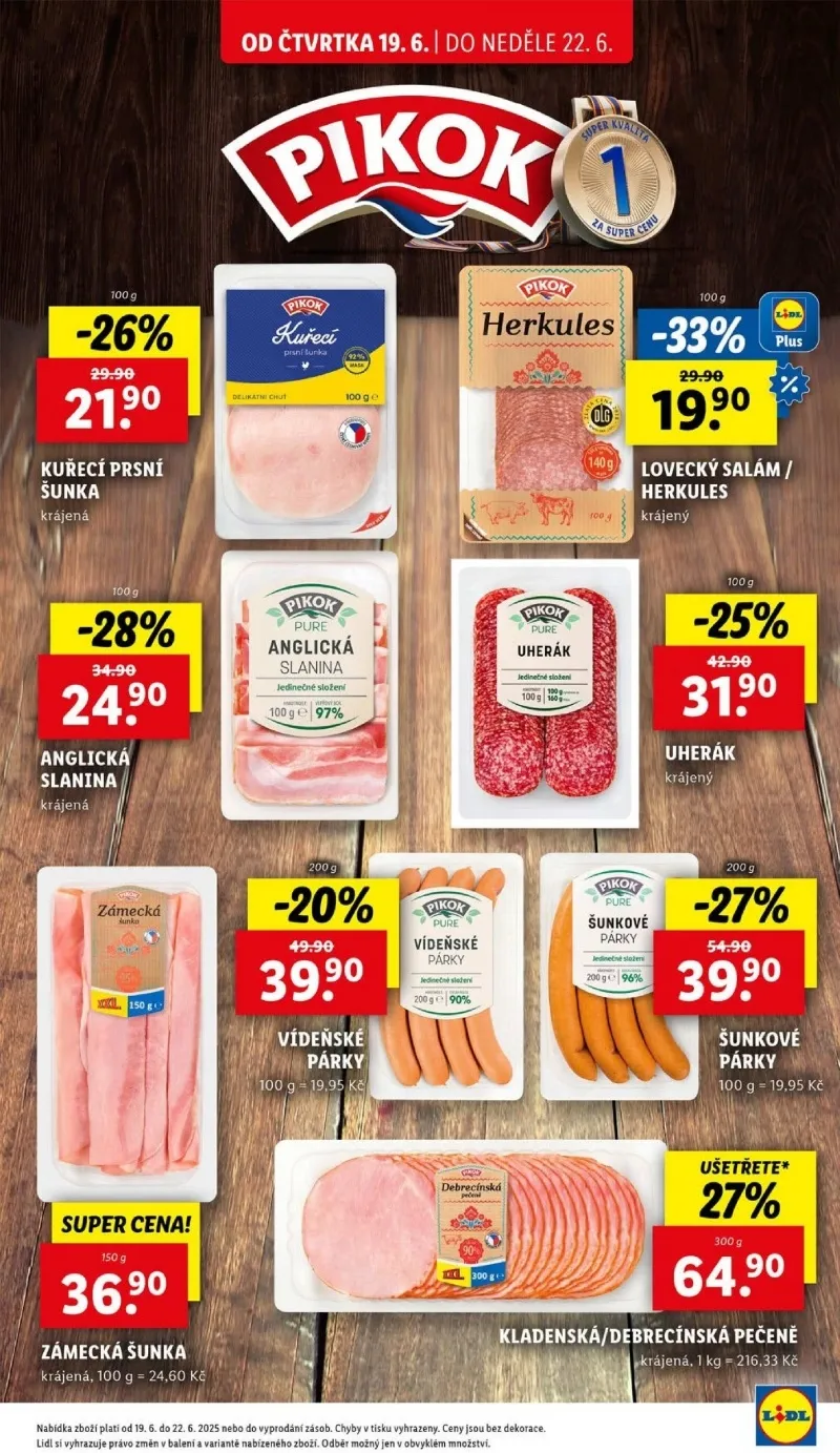 V letáku obchodu Lidl najdete skvělé akční nabídky na různé masné výrobky. Mezi nimi se objevuje kuřecí prsní šunka krájená za cenu 21,00 Kč s 26% slevou. Dále je v nabídce anglická slanina krájená, která je nyní za super cenu 36,00 Kč, což představuje 28% úsporu. Nezapomeňte také na zámeckou šunku, která je k dostání od čtvrtka 19.6. do neděle 22.6. za výhodnou cenu.