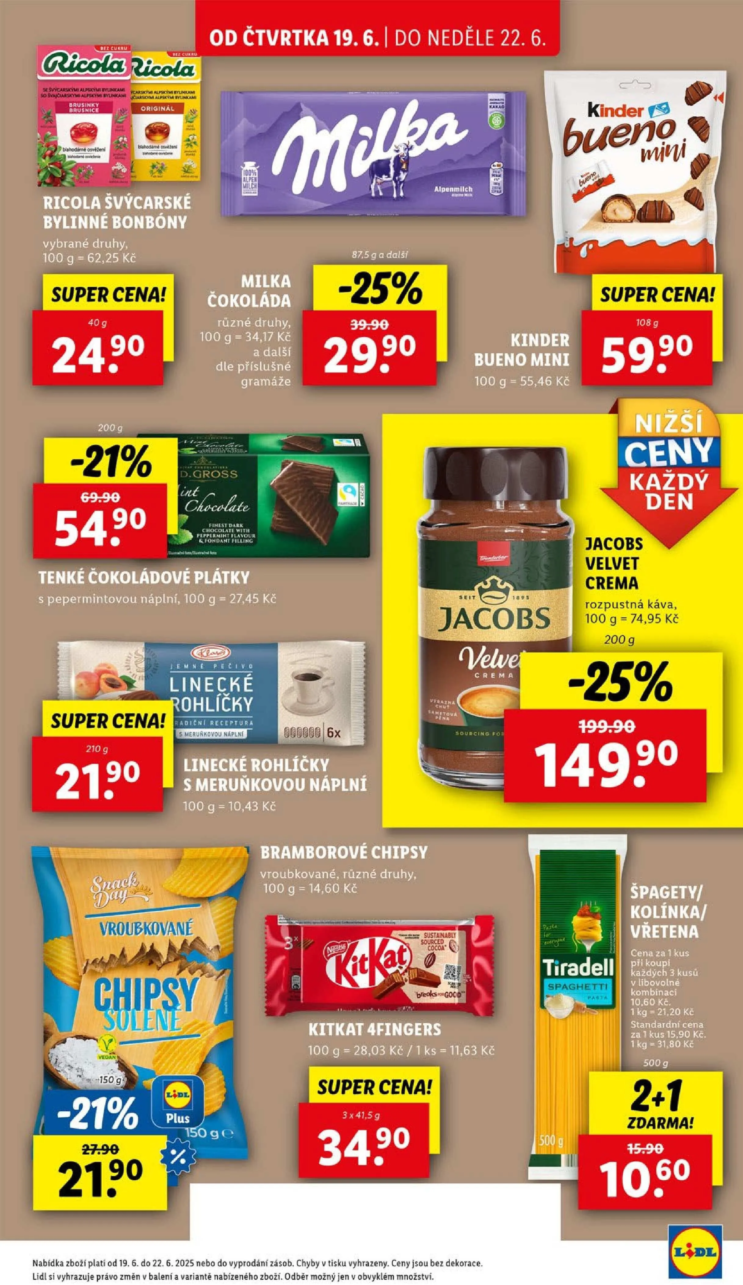 V letáku obchodu Lidl najdete skvělé nabídky od čtvrtka 19.6. do neděle 22.6. Mezi produkty se objevují švýcarské bylinné bonbóny Ricola, které jsou k dostání v balení 100 g za super cenu 62,25 Kč. Dále si můžete vybrat z různých druhů čokolády Milka, kde cena za 100 g činí 34,17 Kč.