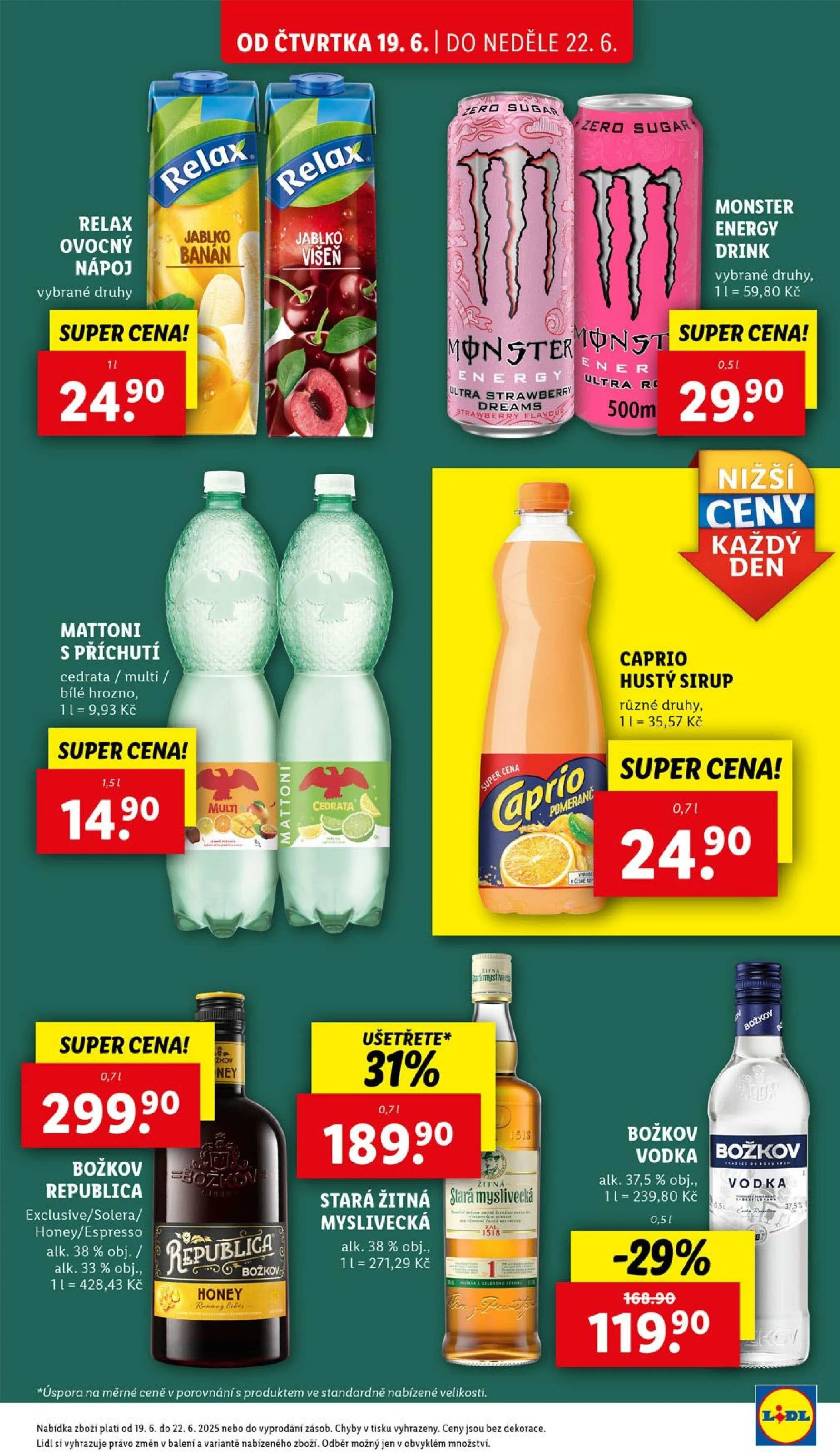 Od čtvrtka 19.6. do neděle 22.6. si nenechte ujít skvělé nabídky v obchodě Lidl! V letáku najdete čerstvá jablka a banány za super ceny. Dopřejte si osvěžující ovocný nápoj Mattoni s příchutí cedrata nebo bílé hrozno za 9,93 Kč.