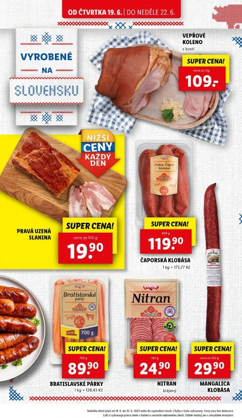 Od čtvrtka 19.6. do neděle 22.6. máte možnost zakoupit skvělé produkty v obchodu Lidl! V nabídce najdete pravou uzenou slaninu za super cenu 61,90 Kč za 100 g. Dále nabízíme bratislavské párky za 128,43 Kč za 1 kg a vepřové koleno s kostí za 109 Kč. Nezapomeňte také na čaporskou klobásu, která je k dispozici za 173,77 Kč za 1 kg. Pro milovníky klobás máme v nabídce také mangalica klobásu za 29,90 Kč. Tato skvělá nabídka platí od 19.6. do 21.6.2025. Těšíme se na vaši návštěvu!