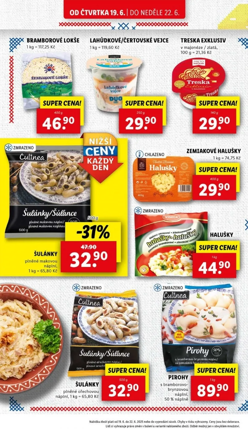 Od čtvrtka 19.6. do neděle 22.6. v obchodě Lidl najdete skvělé nabídky! Mezi nimi jsou bramborové lokše za 117,25 Kč za 1 kg a lahůdkové vejce za 119,60 Kč za 1 kg. Nezapomeňte také na plněné makové šulánky za 65,80 Kč za 1 kg a tresku exklusiv v majonéze za 21,36 Kč. Zajímavou volbou jsou také zemiakové halušky za 74,75 Kč za 1 kg a pirohy s bramborovo-brynzovou náplní. Všechny produkty jsou za super ceny! Nabídka platí do 21.6.2025.