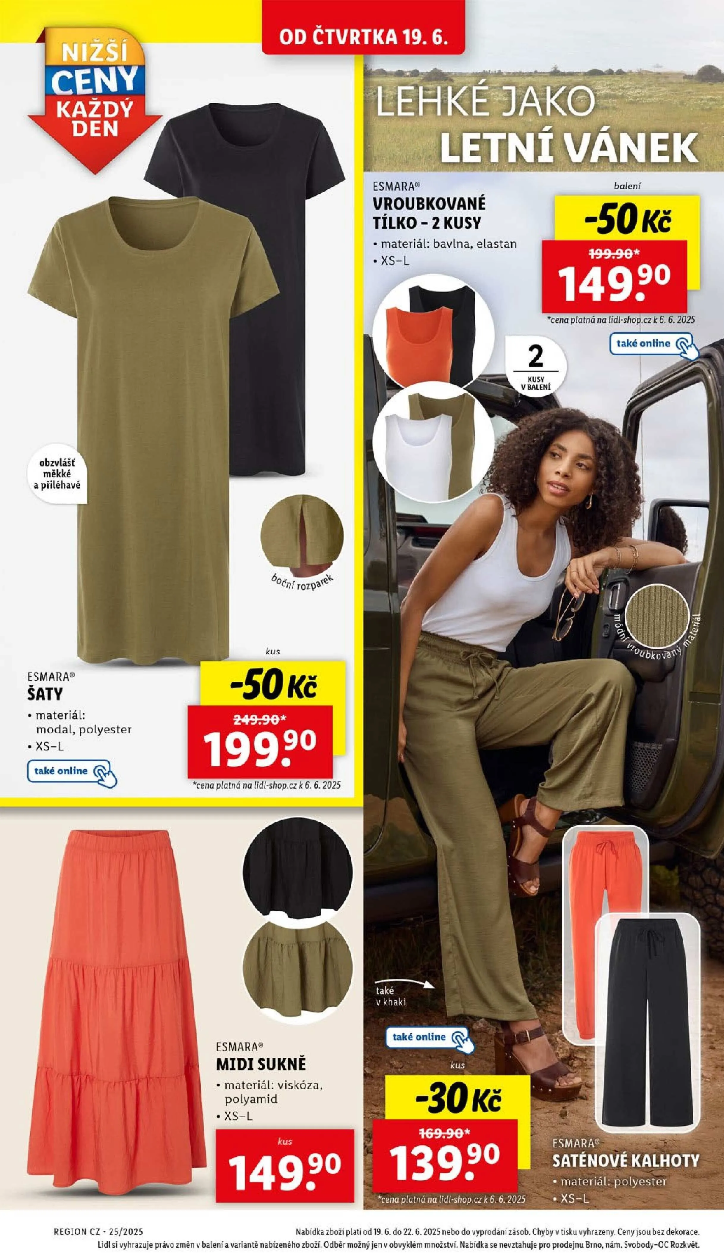 V letáku obchodu Lidl najdete skvělou nabídku módních kousků značky Esmara. Od čtvrtka 19. června si můžete pořídit obzvlášť měkké a přiléhavé šaty vyrobené z kvalitního materiálu (modal, polyester) v velikostech XS-L. Dále jsou k dispozici midi sukně z viskózy a polyamidu, stejně jako vroubkovaná tílka v balení po dvou kusech, vyrobená z bavlny a elastanu. Nezapomeňte také na saténové kalhoty, které jsou pohodlné a stylové. Všechny produkty jsou dostupné online a ceny jsou platné do vyprodání zásob. Nepropásněte tuto skvělou příležitost!