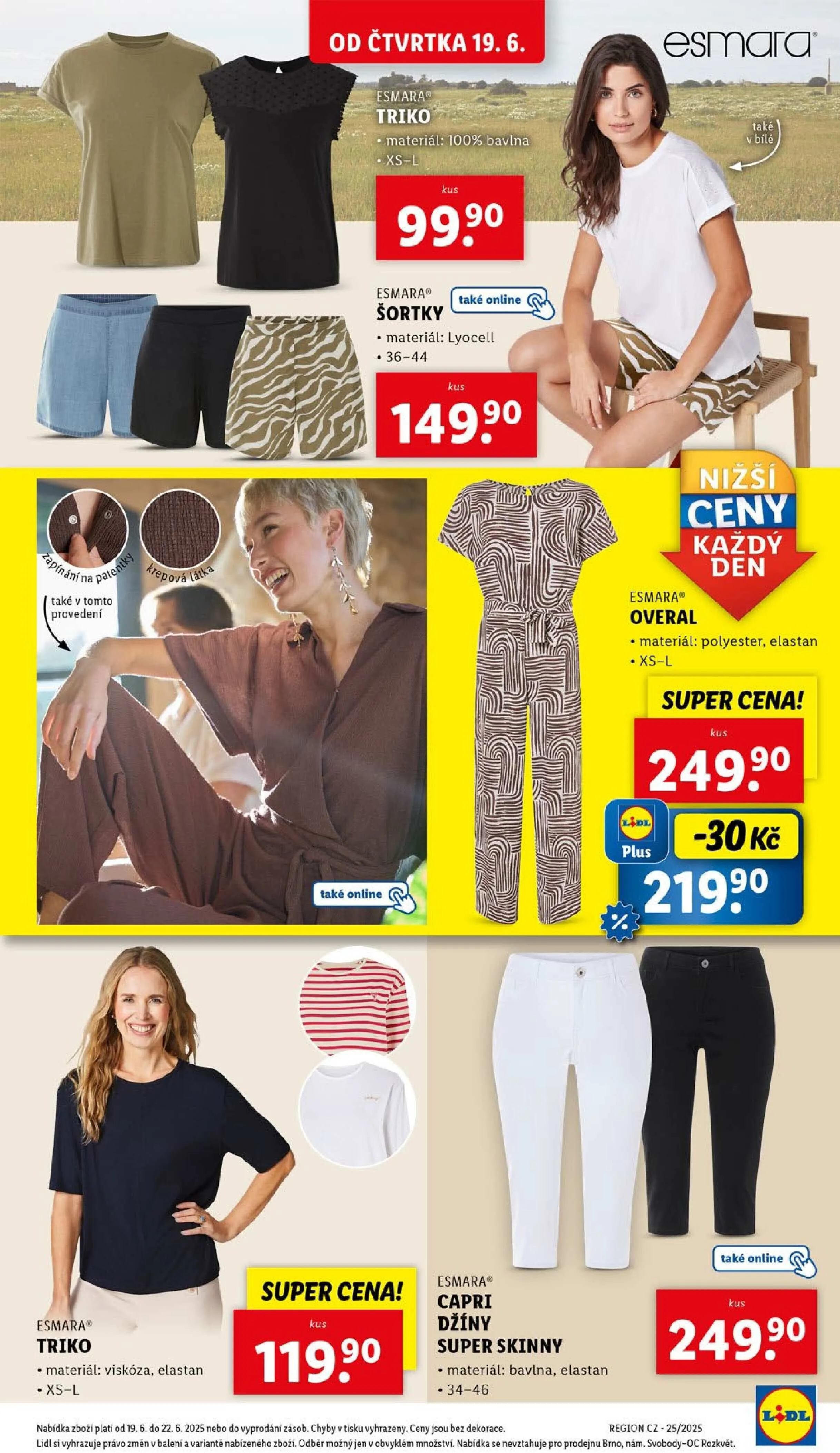 Od čtvrtka 19.6. v obchodě Lidl najdete skvělé produkty za super ceny! Nabízíme triko z 100% bavlny za 99 Kč, dostupné ve velikostech XS-L. Dále máme šortky z lyocellu v bílé barvě, které jsou k dispozici ve velikostech 36-44.