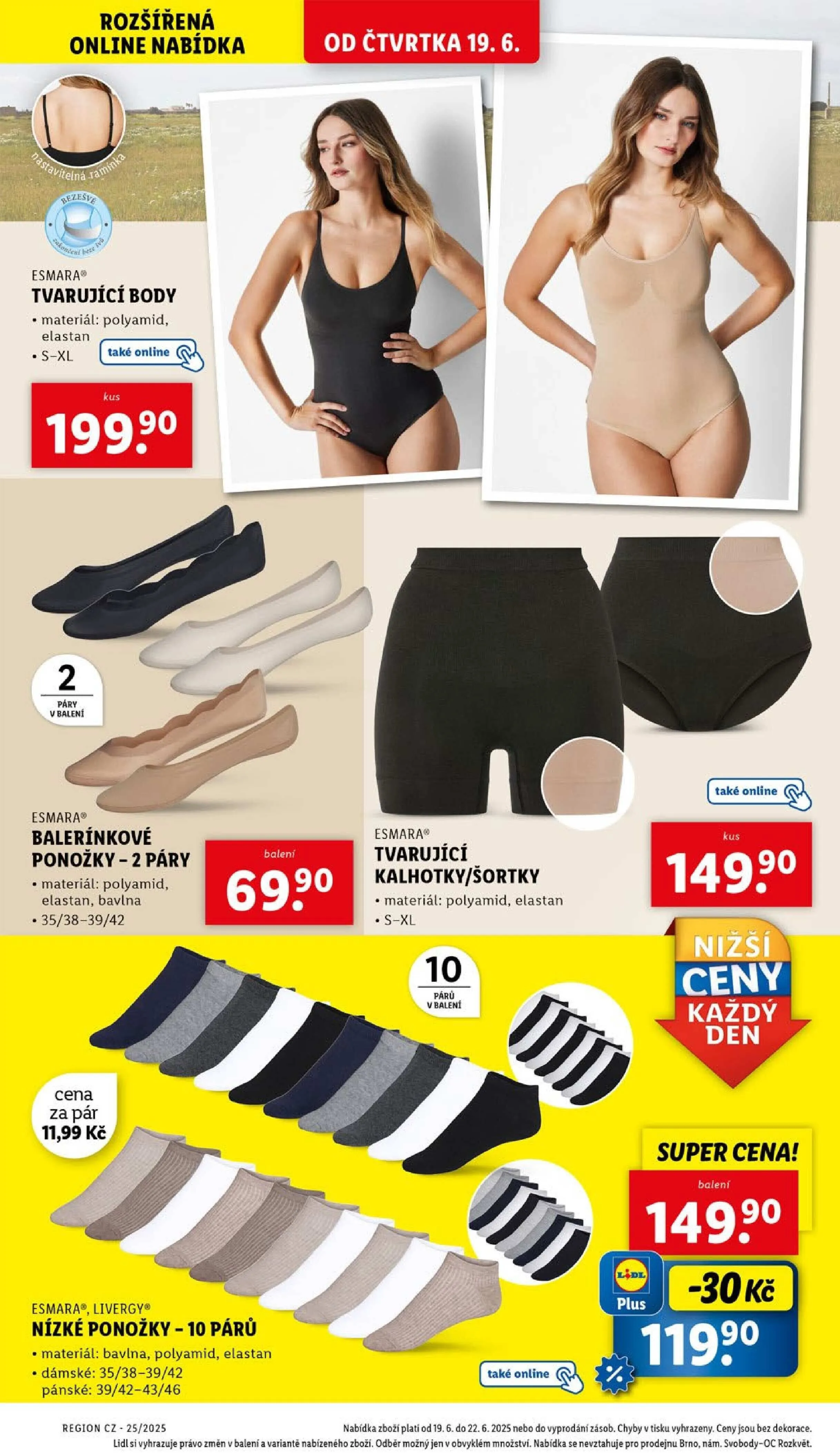 V letáku obchodu Lidl najdete rozšířenou online nabídku produktů značky Esmara a Livergy. Mezi novinkami jsou tvarující body vyrobené z polyamidu a elastanu, dostupné ve velikostech S-XL za cenu 199 Kč. Dále si můžete pořídit balerínkové ponožky v balení po dvou párech, které kombinují polyamid, elastan a bavlnu, za 11,99 Kč za pár.