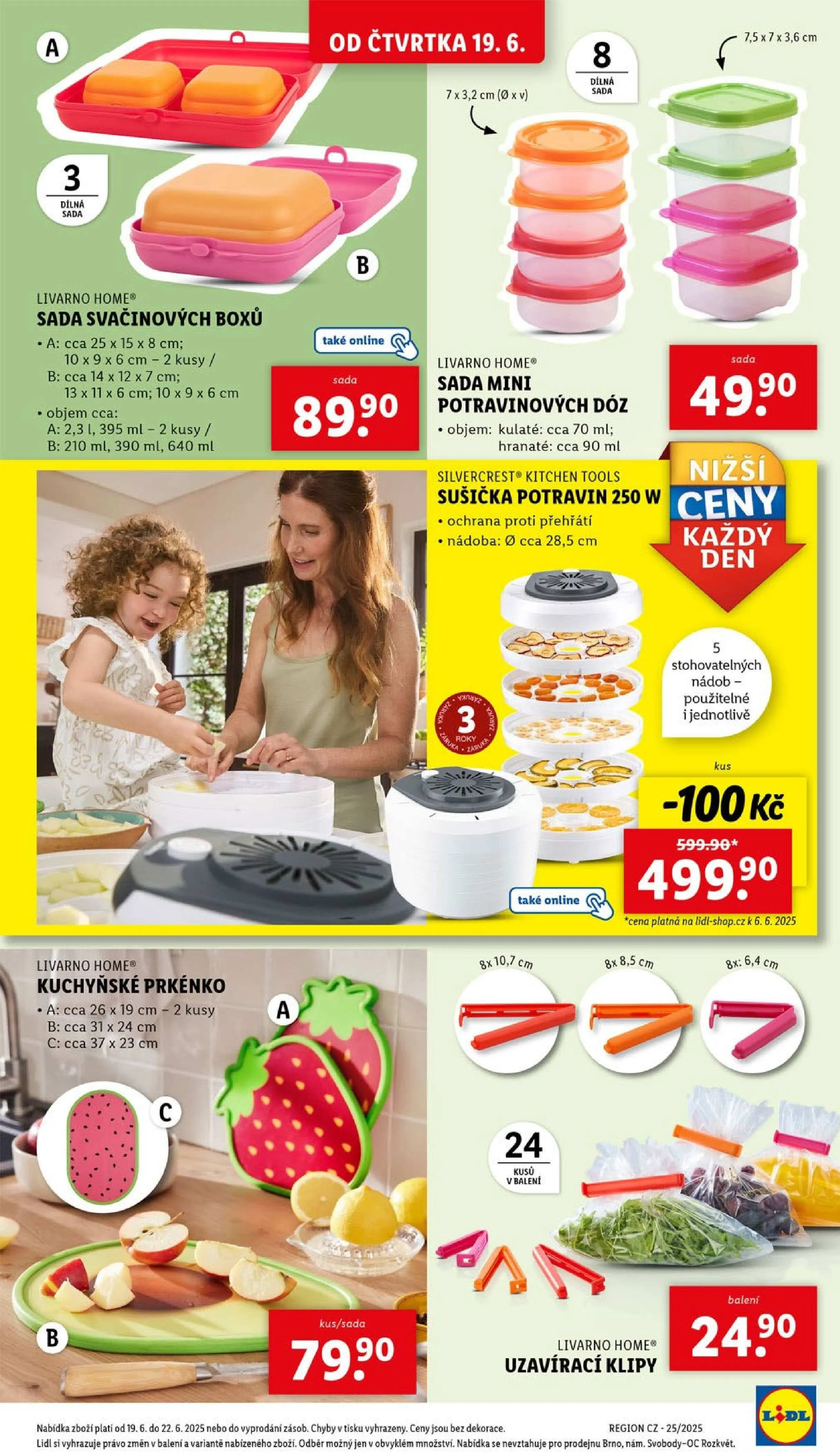 Od čtvrtka 19.6. v obchodě Lidl najdete skvělou nabídku produktů pro vaši domácnost. Mezi nimi je dílná sada a sada svačinových boxů Livarno Home, které jsou k dispozici v různých velikostech a objemech. Dále si můžete pořídit kuchyňské prkénko v několika variantách, které usnadní přípravu vašich oblíbených pokrmů.