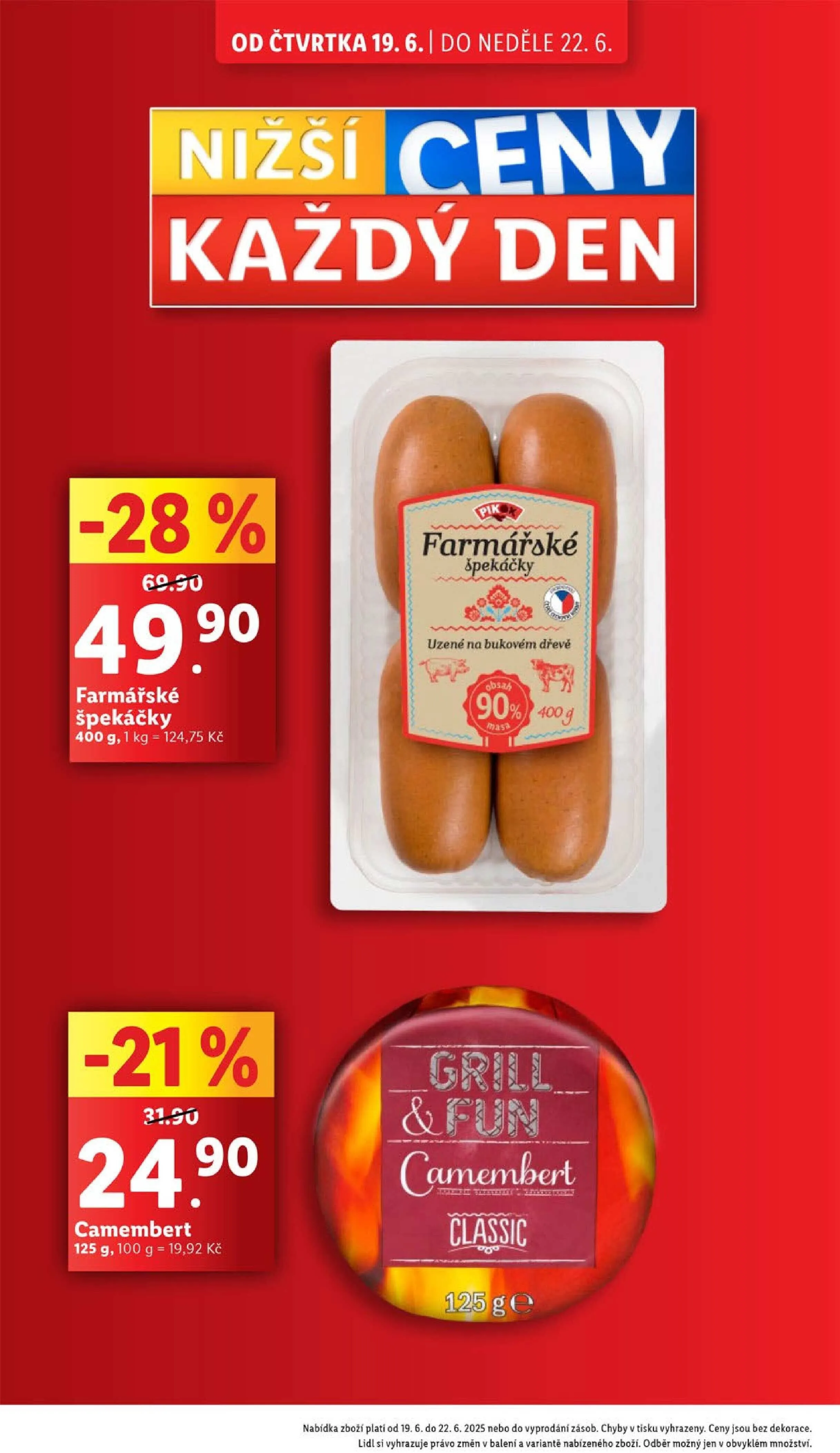 Od čtvrtka 19.6. do neděle 22.6. máte možnost zakoupit skvělé produkty v obchodě Lidl. V nabídce najdete farmářské špekáčky o hmotnosti 400 g za cenu 49,90 Kč, což představuje slevu 28 % z původní ceny 69,30 Kč. Dále si můžete dopřát lahodný camembert o hmotnosti 125 g za cenu 24 Kč, což je 21 % sleva z ceny 19,92 Kč za 100 g. Tato nabídka platí do vyprodání zásob, tak neváhejte a navštivte nás!