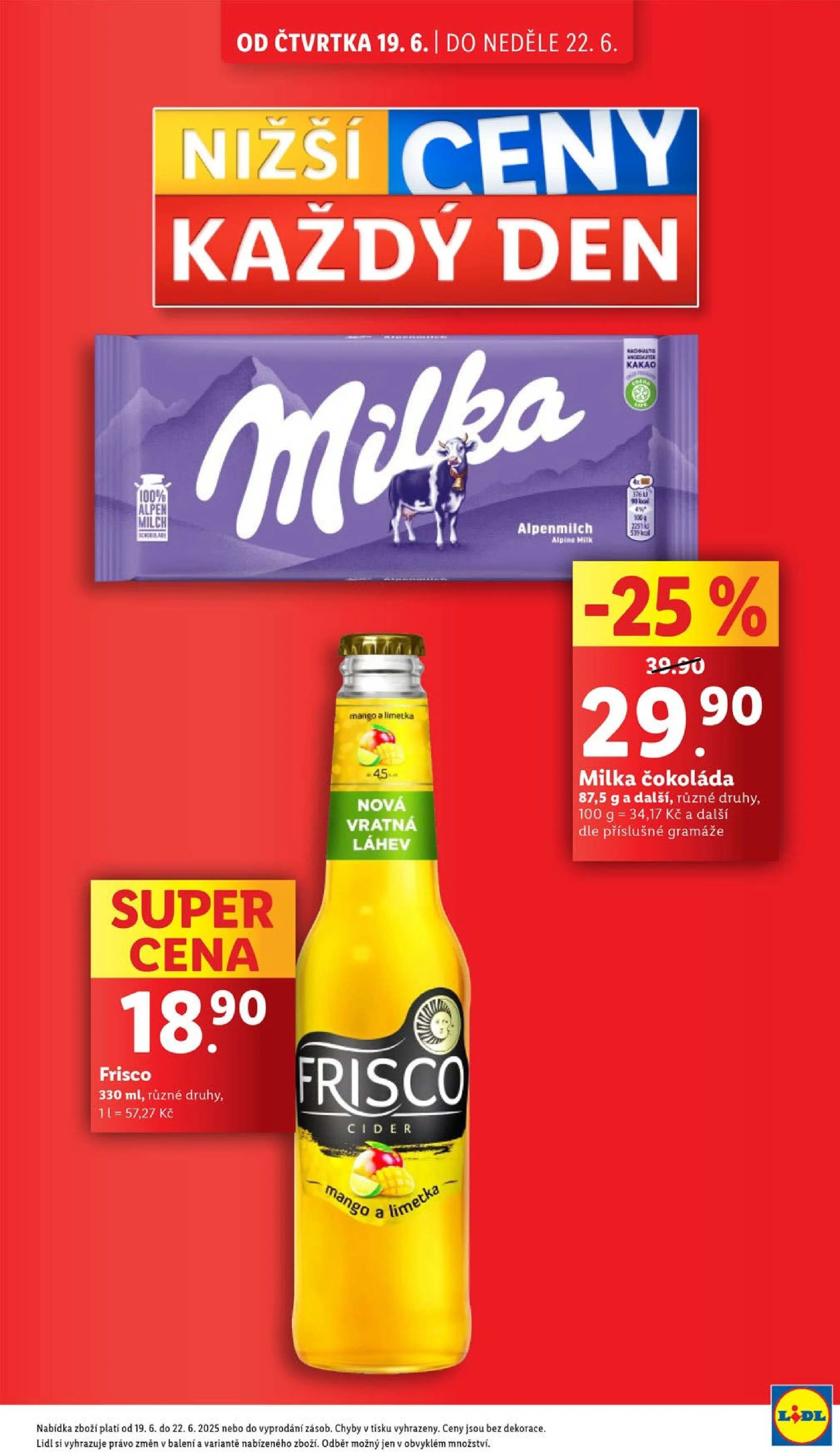 Od čtvrtka 19.6. do neděle 22.6. přichází Lidl s atraktivní nabídkou produktů za nižší ceny. V letáku najdete kakao 100% a různé druhy Frisco v 330 ml za skvělou cenu 57,27 Kč. Nezapomeňte také na novou vratnou láhev limetky a oblíbenou Milka čokoládu o hmotnosti 87,5 g, která je k dispozici za 34,17 Kč na 100 g. Tato nabídka platí do vyprodání zásob, takže neváhejte a přijďte si vybrat! Ceny jsou uvedeny bez dekorace a Lidl si vyhrazuje právo na změny v balení a variantách zboží. Odběr je možný pouze v obvyklém množství.