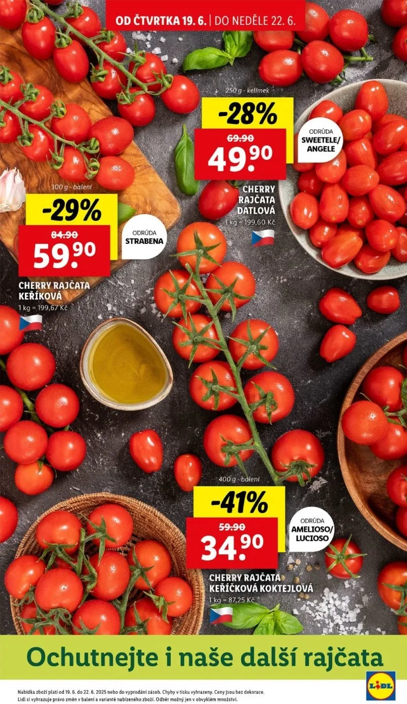 Od čtvrtka 19.6. do neděle 22.6. si můžete v Lidlu vychutnat skvělou nabídku cherry rajčat. V akci jsou různé odrůdy, jako například Sweetelle a Amelioso/Lucioso, s cenovým snížením až o 29%. Cherry rajčata jsou k dostání v kelímku za 59,90 Kč a datlová rajčata za 49,90 Kč za kilogram. Nezapomeňte ochutnat i další naše rajčata! Akce platí do vyprodání zásob.