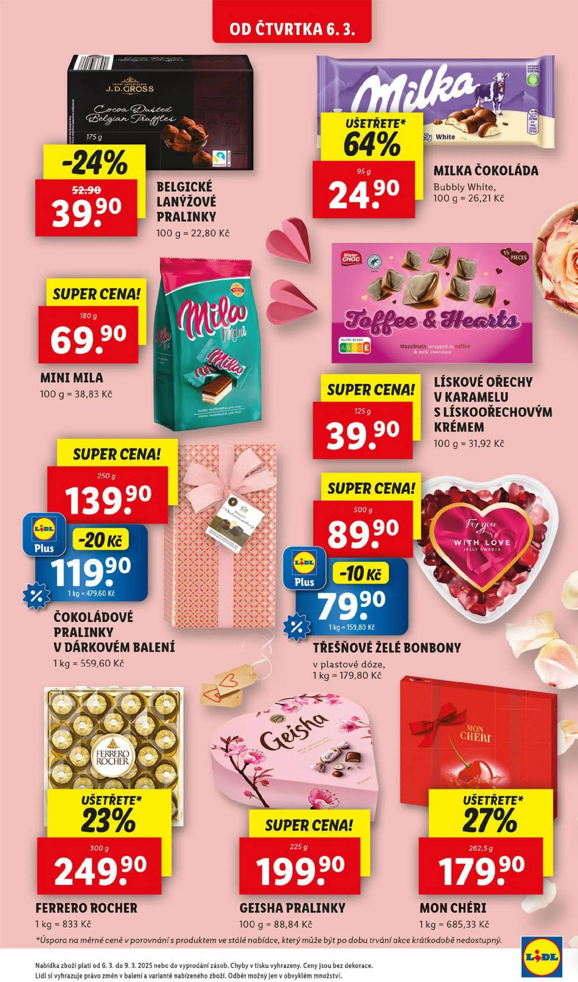 V letáku obchodu Lidl najdete skvělou nabídku sladkostí a pralinek. Mezi nejzajímavější produkty patří belgické lanýžové pralinky j. d.gross o hmotnosti 175 g za super cenu 39,90 Kč. Dále si můžete vychutnat mini mila čokoládové pralinky v dárkovém balení, které jsou k dostání za 69,90 Kč za 100 g.