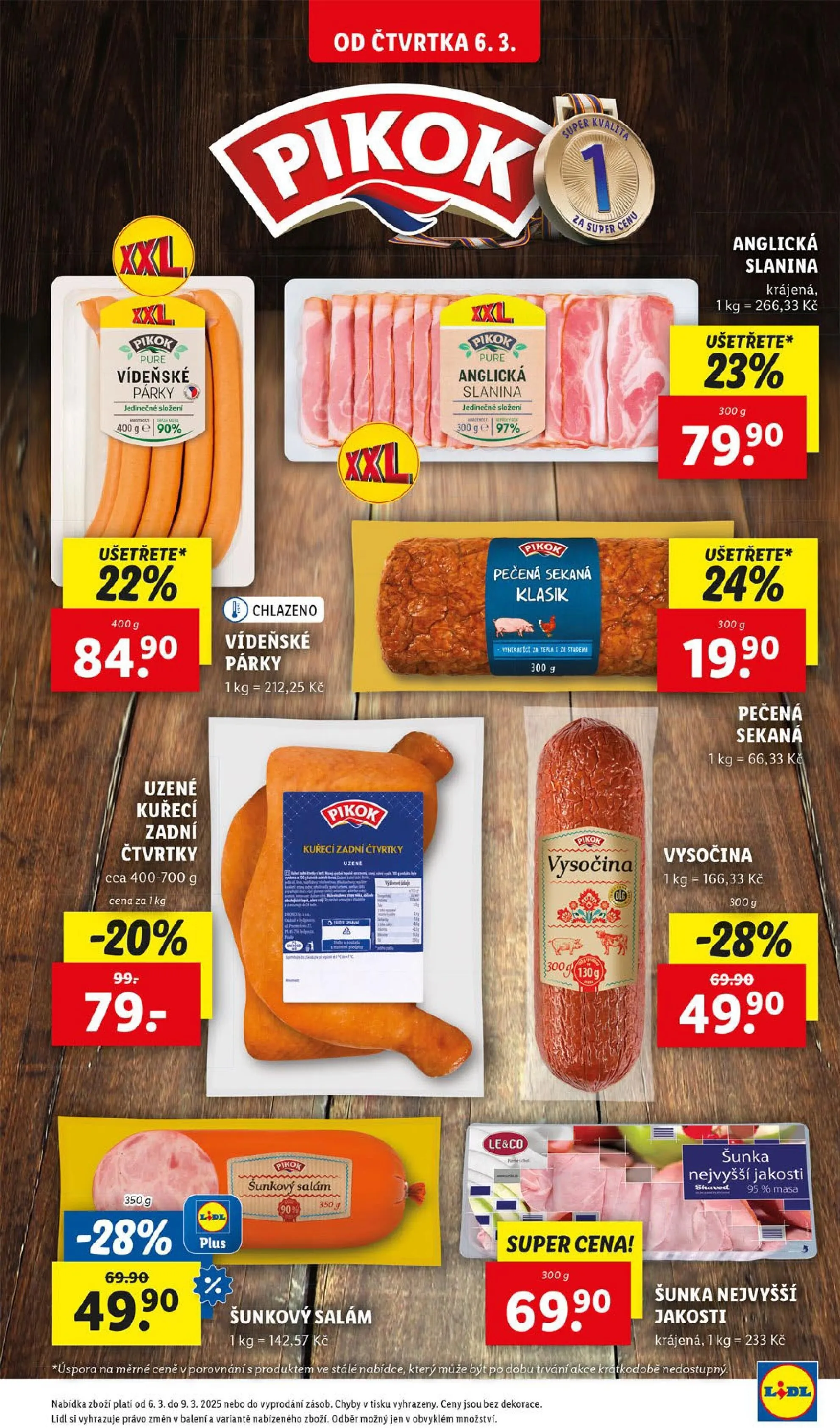 V letáku obchodu Lidl najdete skvělé nabídky na různé masné výrobky. Od čtvrtka 6. března si můžete pořídit vídeňské párky za cenu 212,25 Kč za kilogram. Dále jsou v akci uzené kuřecí zadní čtvrtky, které váží cca 400-700 g. Anglická slanina, krájená, je k dostání za 266,33 Kč za kilogram. Nezapomeňte také na pečenou sekanou, která vychází na 66,33 Kč za kilogram. A pro milovníky šunky je tu šunka nejvyšší jakosti, která je v akci za 233 Kč za kilogram. Nabídka platí do 9. března 2025 nebo do vyprodání zásob. Nepropásněte tyto skvělé ceny!