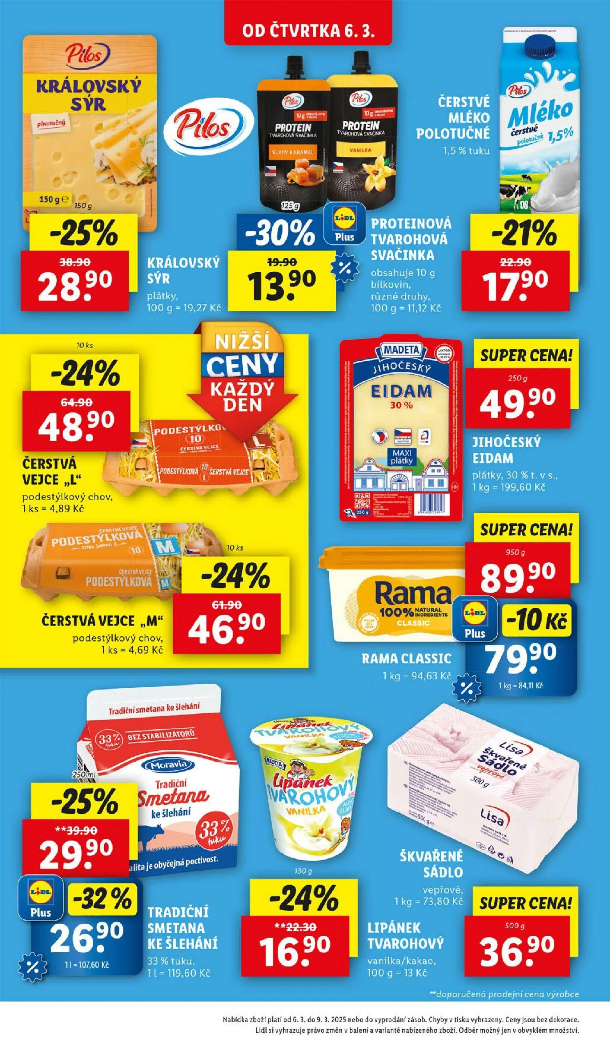 Od čtvrtka 6.3. v obchodě Lidl najdete skvělé akční nabídky! Mezi nimi je královský sýr 150 g se slevou 25%, čerstvá vejce „L” z podestýlkového chovu za 4,89 Kč za kus a proteinová svačinka v různých příchutích. Nezapomeňte také na tradiční smetanu ke šlehání Moravia s 33 % tuku a čerstvé polotučné mléko.