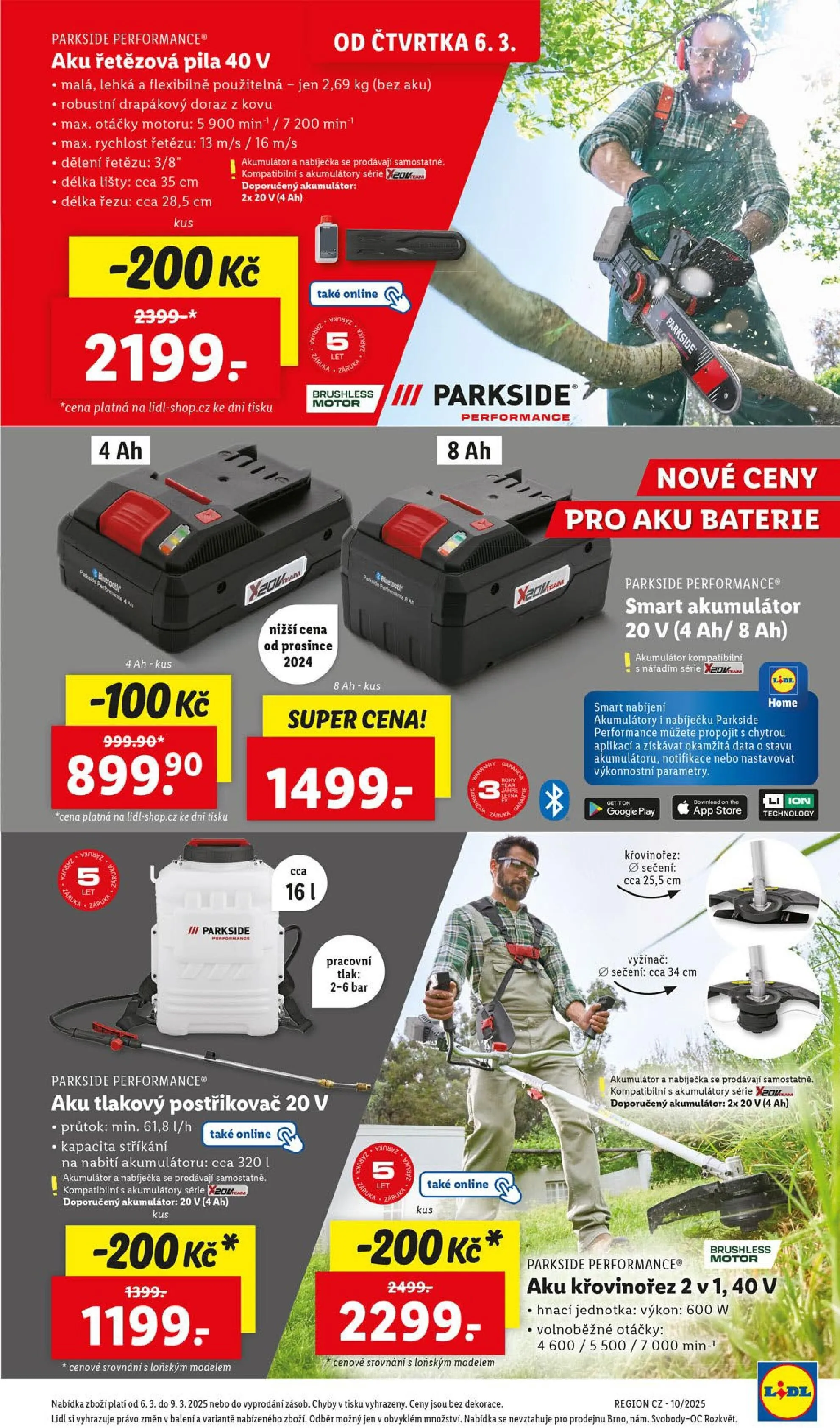 V letáku obchodu Lidl najdete skvělé produkty značky Parkside Performance, které jsou ideální pro zahradní práce a údržbu. Od čtvrtka 6. března si můžete pořídit aku řetězovou pilu 40 V, která váží pouze 2,69 kg a nabízí maximální rychlost řetězu až 16 m/s. Akumulátor a nabíječka se prodávají samostatně, doporučený akumulátor je 2x 20 V (4 Ah) za cenu 2199 Kč.
