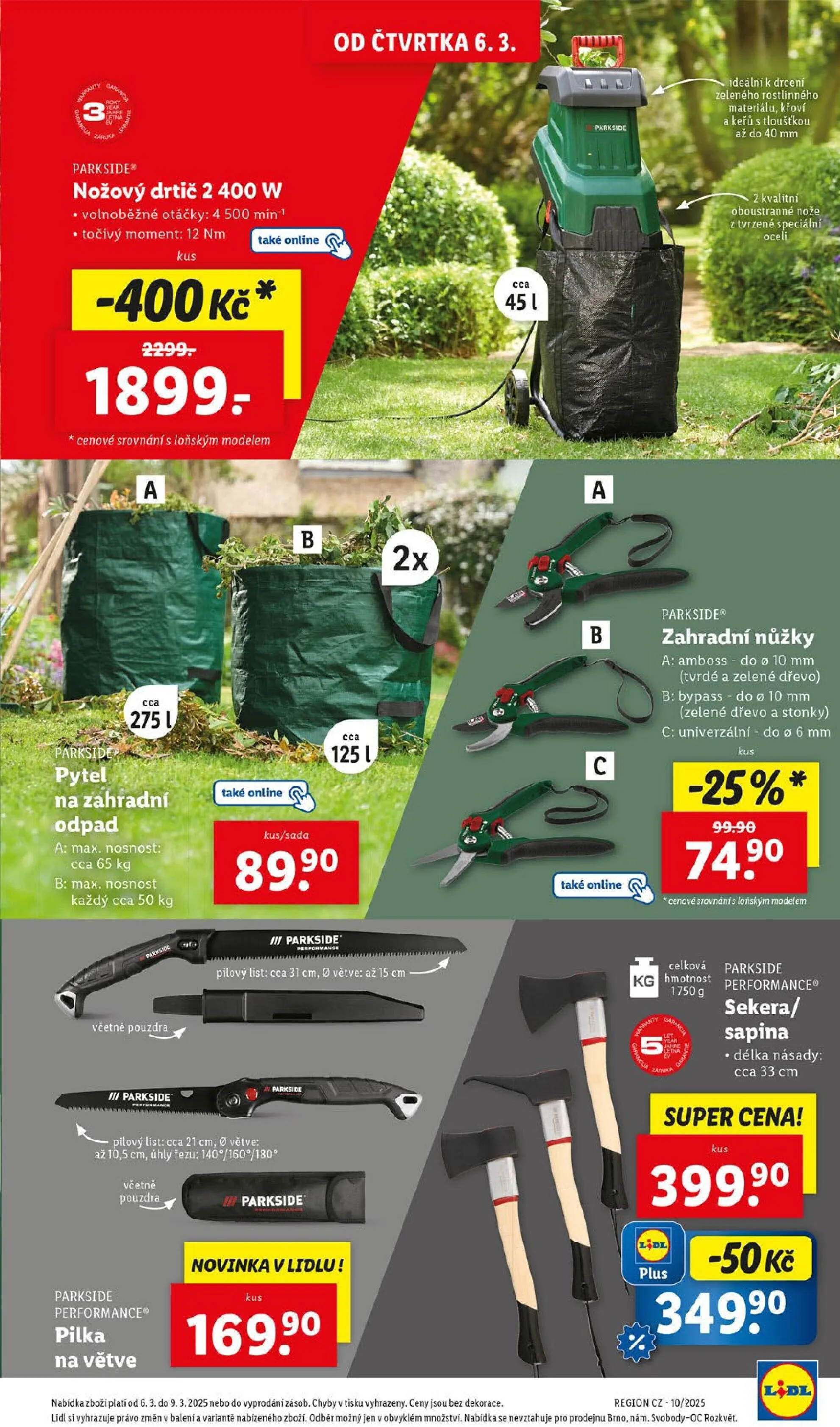 V letáku obchodu Lidl najdete širokou nabídku zahradních produktů značky Parkside. Mezi novinkami se objevuje nožový drtič s výkonem 2400 W, který zvládne až 15 cm silné větve a je k dostání za 400 Kč. Dále nabízíme zahradní nůžky s různými typy ostří, které usnadní práci s dřevinami. Nechybí ani pilka na větve s délkou listu 31 cm, ideální pro údržbu zahrady. Všechny produkty jsou k dispozici online a v prodejnách od 6. března do 9. března 2025, nebo do vyprodání zásob. Nezapomeňte, že ceny jsou bez dekorace a mohou se lišit v závislosti na prodejně.