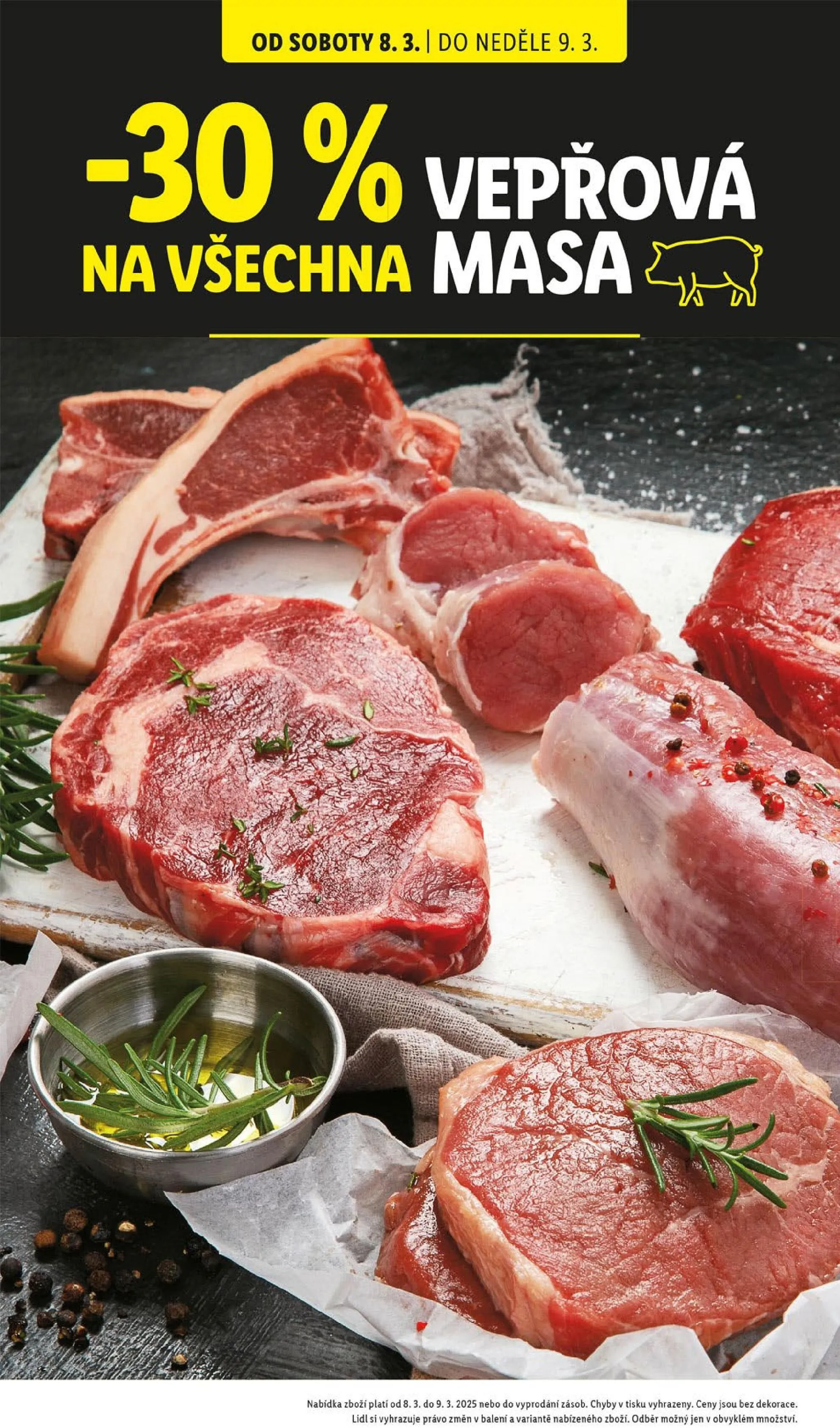 Od soboty 8. března do neděle 9. března můžete v obchodě Lidl využít skvělou akci - sleva 30 % na všechna vepřová masa. Nezmeškejte tuto příležitost a dopřejte si kvalitní maso za výhodné ceny. Navštivte nás a objevte široký výběr produktů!