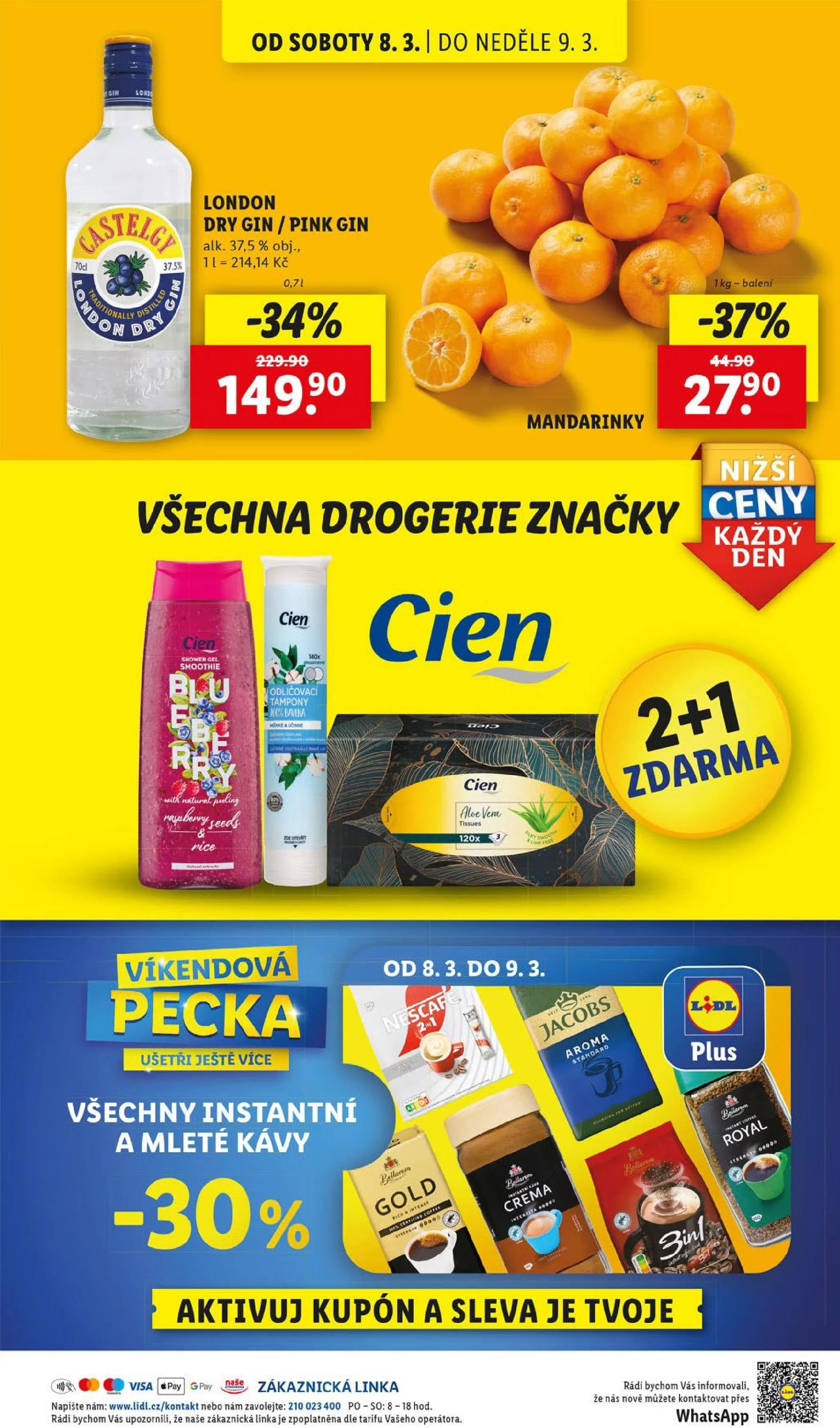 Od soboty 8.3. do neděle 9.3. si v Lidlu můžete vychutnat skvělé nabídky! Na výběr je London Dry Gin a Pink Gin s alkoholem 37,5 % za cenu 214,14 Kč. Mandarinky jsou nyní k dostání se slevou 30 %. Nezapomeňte také na drogerii značky Cien, která je v akci. Víkendová nabídka zahrnuje smoothie a dietní tampony. Ušetřete ještě více na všech instantních a mletých kávách Cien. Aktivujte kupón a sleva je vaše! Pro více informací nás můžete kontaktovat na zákaznické lince nebo přes WhatsApp. Těšíme se na vaši návštěvu!