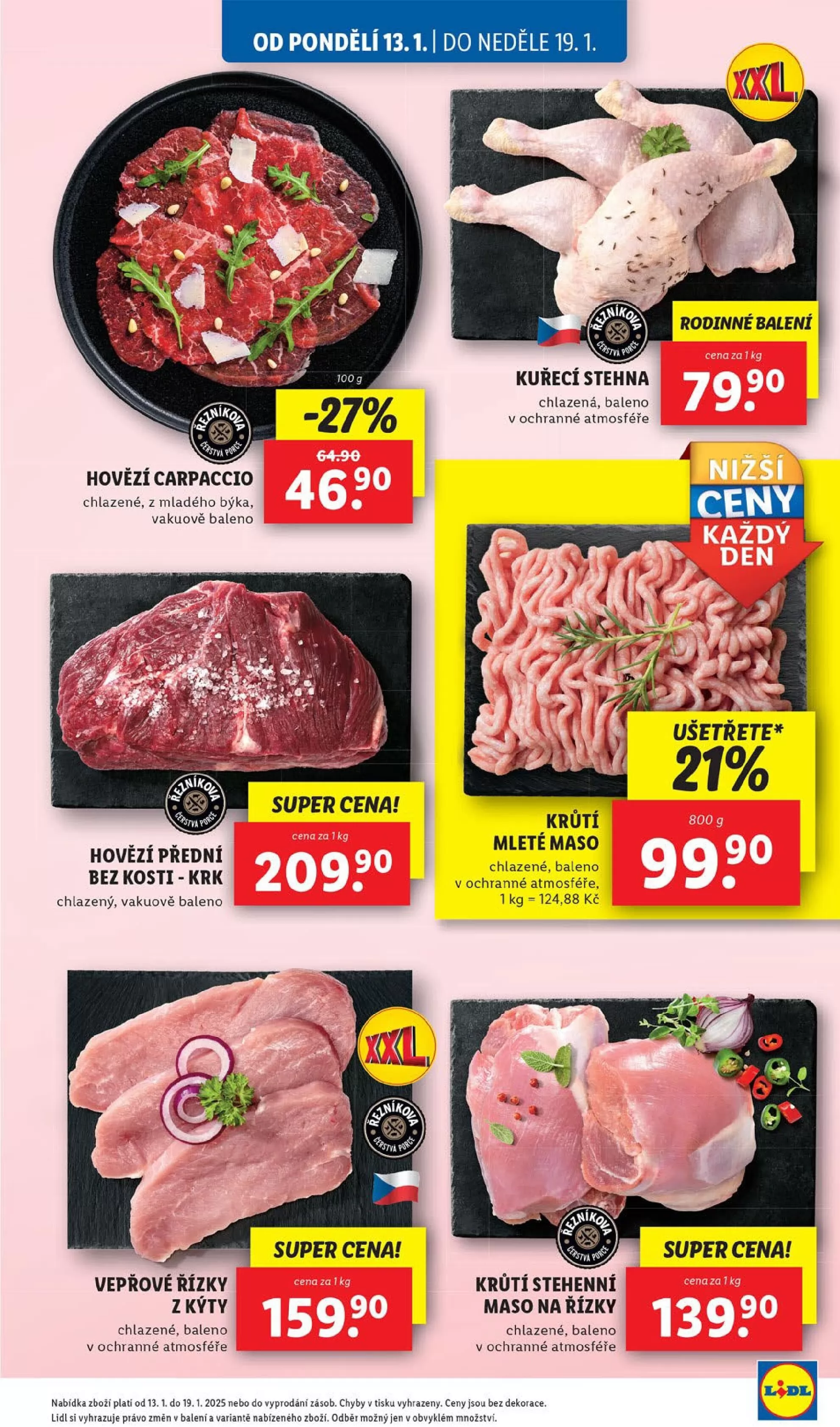 Od pondělí 13.1. do neděle 19.1. máte možnost zakoupit v Lidlu širokou nabídku kvalitních masných výrobků. Mezi nimi najdete hovězí carpaccio z mladého býka, chlazené a vakuově balené. Dále nabízíme kuřecí stehna v rodinném balení, chlazená a balená v ochranné atmosféře.