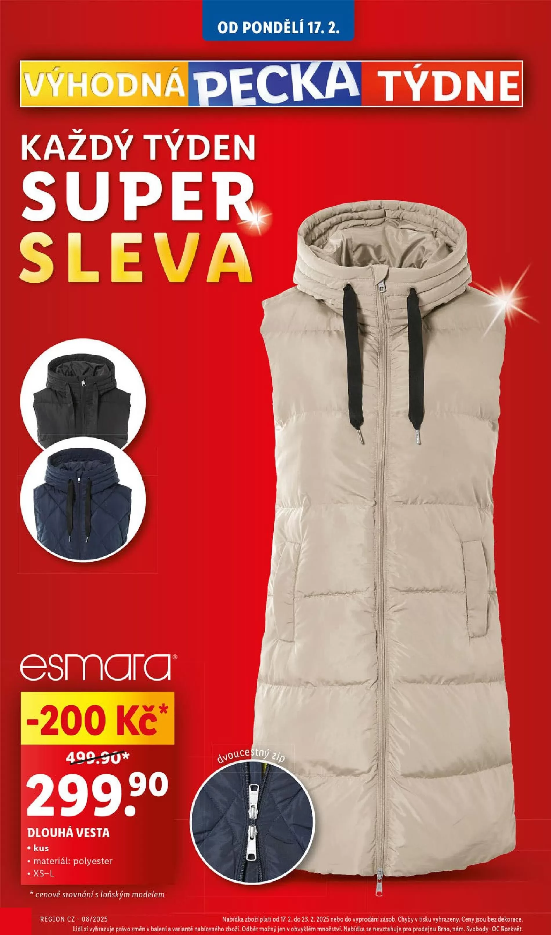 Od 17.2. máte možnost využít skvělé slevy v obchodě Lidl! Každý týden přinášíme super nabídky, které potěší vaše peněženky. Například dlouhá vesta za skvělou cenu 299 Kč, vyrobená z kvalitního polyesteru a dostupná ve velikostech XS-L. Nezapomeňte, že akce platí do 23.2.2025 nebo do vyprodání zásob. Přijďte si pro své oblíbené produkty a využijte výhodné ceny!