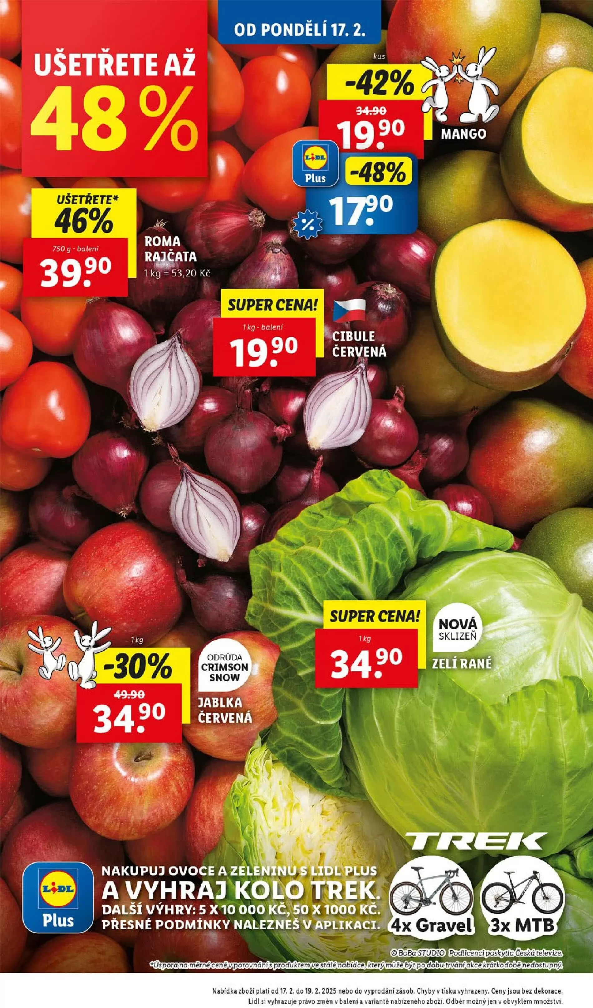 Ušetřete až 42% na vybraných produktech v letáku obchodu Lidl od pondělí 17.2. Mezi nabídkou najdete mango v balení 750 g za super cenu 39,90 Kč. Dále nabízíme rajčata odrůdy Roma za 53,20 Kč za 1 kg a červená jablka za 34,20 Kč za 1 kg. Nezapomeňte také na zelí, které je nyní v akci. Navíc, při nákupu ovoce a zeleniny můžete vyhrát kolo a další skvělé ceny. Akce platí do 19.2.2025 nebo do vyprodání zásob. Ceny jsou bez dekorace a Lidl si vyhrazuje právo na změny v nabídce.
