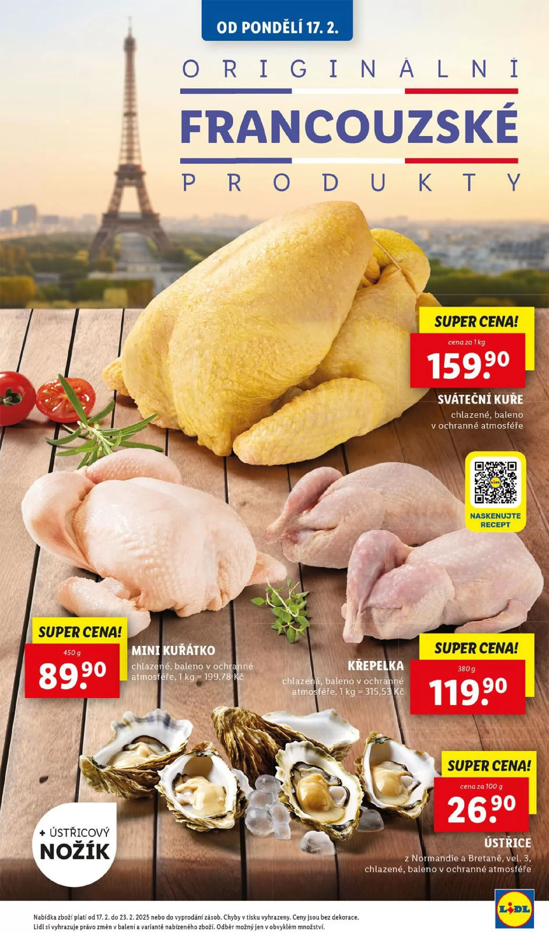 Od 17.2. v obchodech Lidl najdete skvělé produkty za super ceny! Mezi nimi se objevuje originální francouzské sváteční kuře, chlazené a balené v ochranné atmosféře, za cenu 89 Kč za 450 g. Dále nabízíme křepelku, také balenou v ochranné atmosféře, za 315,5 Kč za 1 kg. Nezapomeňte vyzkoušet ústřice z Normandie a Bretaně, chlazené a balené, za 26 Kč za 100 g. Tato nabídka platí od 17.2. do 23.2.2025 nebo do vyprodání zásob. Ceny jsou bez dekorace a Lidl si vyhrazuje právo na změny v balení a variantách nabízeného zboží.
