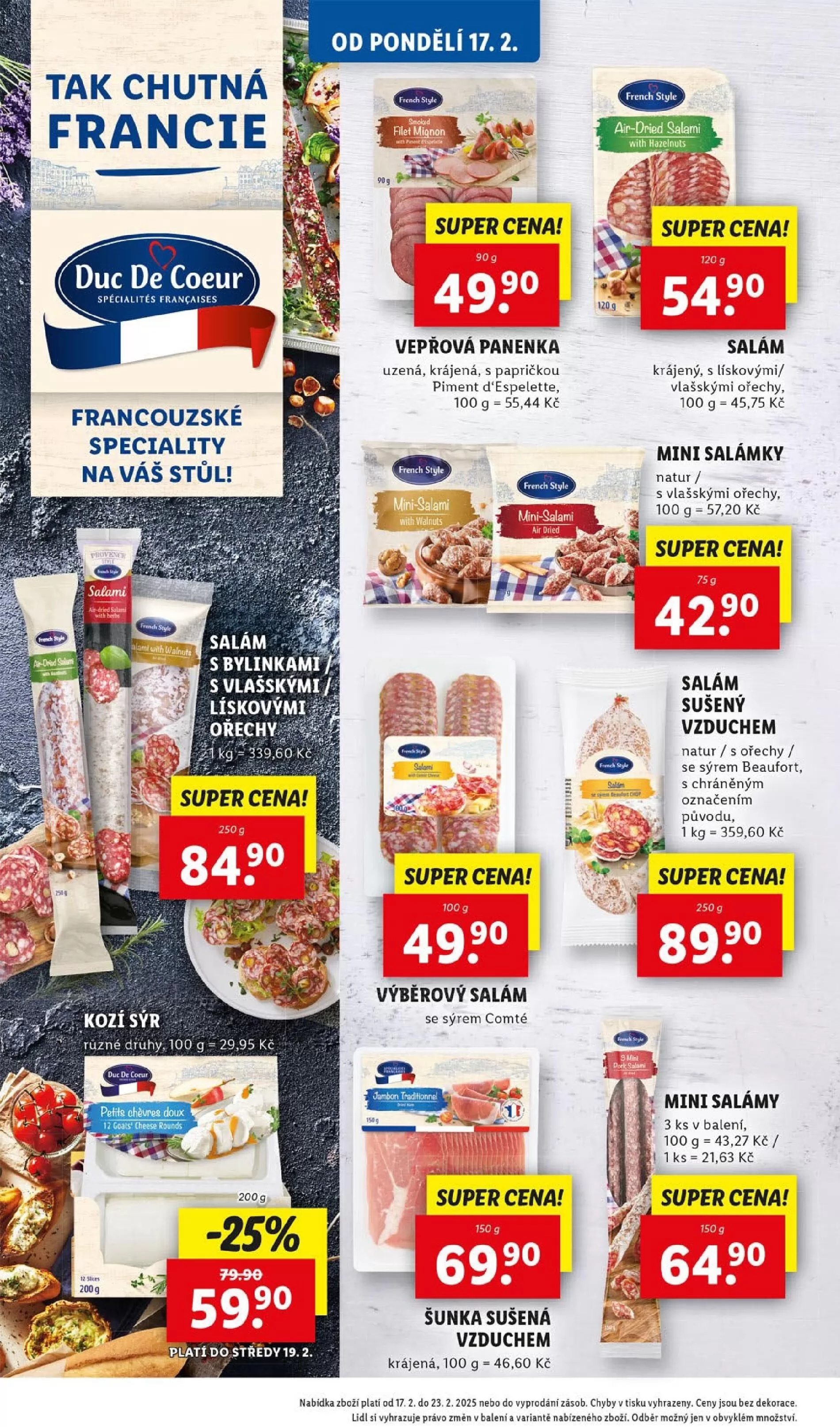 V letáku obchodu Lidl najdete širokou nabídku francouzských specialit, které obohatí váš stůl! Od pondělí 17.2. můžete zakoupit uzenou vepřovou panenku s papričkou piment d'Espelette za skvělou cenu 49,00 Kč. Dále nabízíme salám s bylinkami a vlašskými ořechy, který je nyní za 250 g pouze 84,00 Kč.
