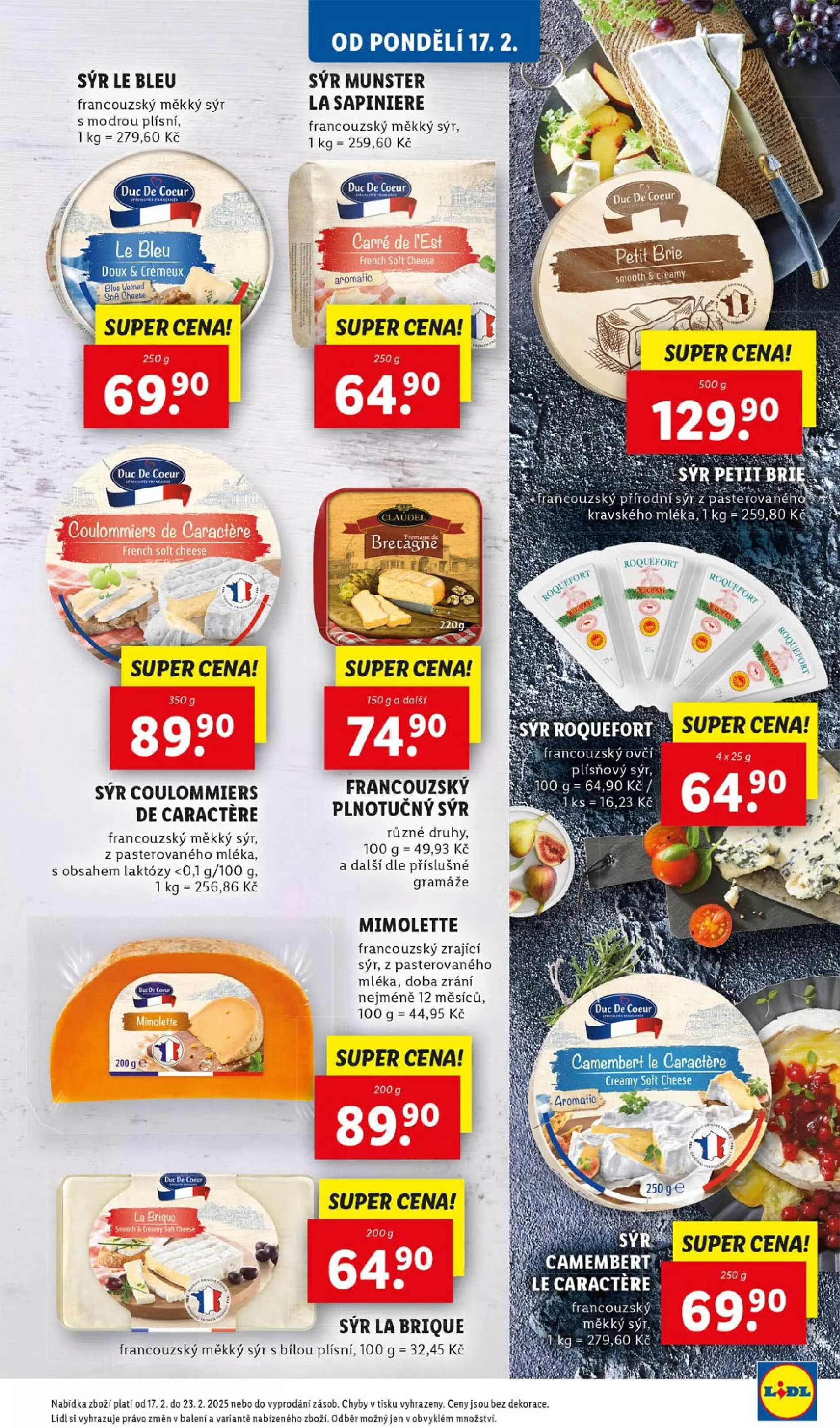 V letáku obchodu Lidl najdete širokou nabídku francouzských sýrů za skvělé ceny! Mezi nimi je sýr Le Bleu, měkký sýr s modrou plísní za 279,60 Kč/kg. Dále nabízíme sýr Coulommiers de Caract?re, který je z pasterovaného mléka a má obsah laktózy 9/100 g, za 256,86 Kč/kg.