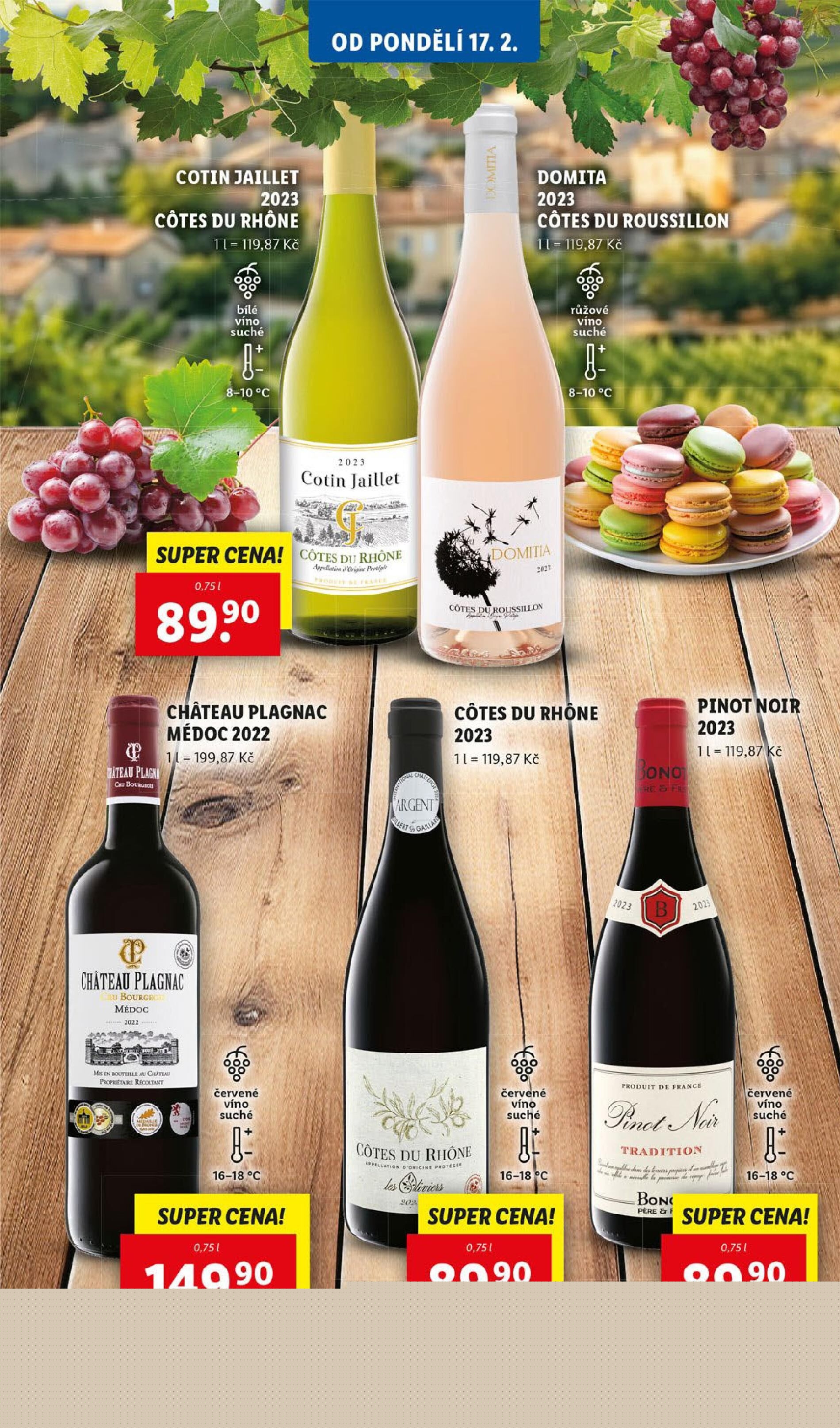 Od pondělí 17.2. si můžete v obchodě Lidl vybrat z široké nabídky vín. Mezi nimi najdete Cotin Jaillet Côtes du Rhône za skvělou cenu 119,87 Kč. Dále je v nabídce Château Plagnac Médoc 2022 za 199,87 Kč a Côtes du Roussillon za 119,87 Kč. Nezapomeňte také na růžové víno, které je suché a ideální při teplotě 8-10 °C. Všechny produkty jsou k dispozici za super ceny, například Côtes du Rhône za 89,90 Kč. Nabídka platí od 17.2. do 2.2.2025 nebo do vyprodání zásob. Další výrobky najdete ve vašem online letáku.