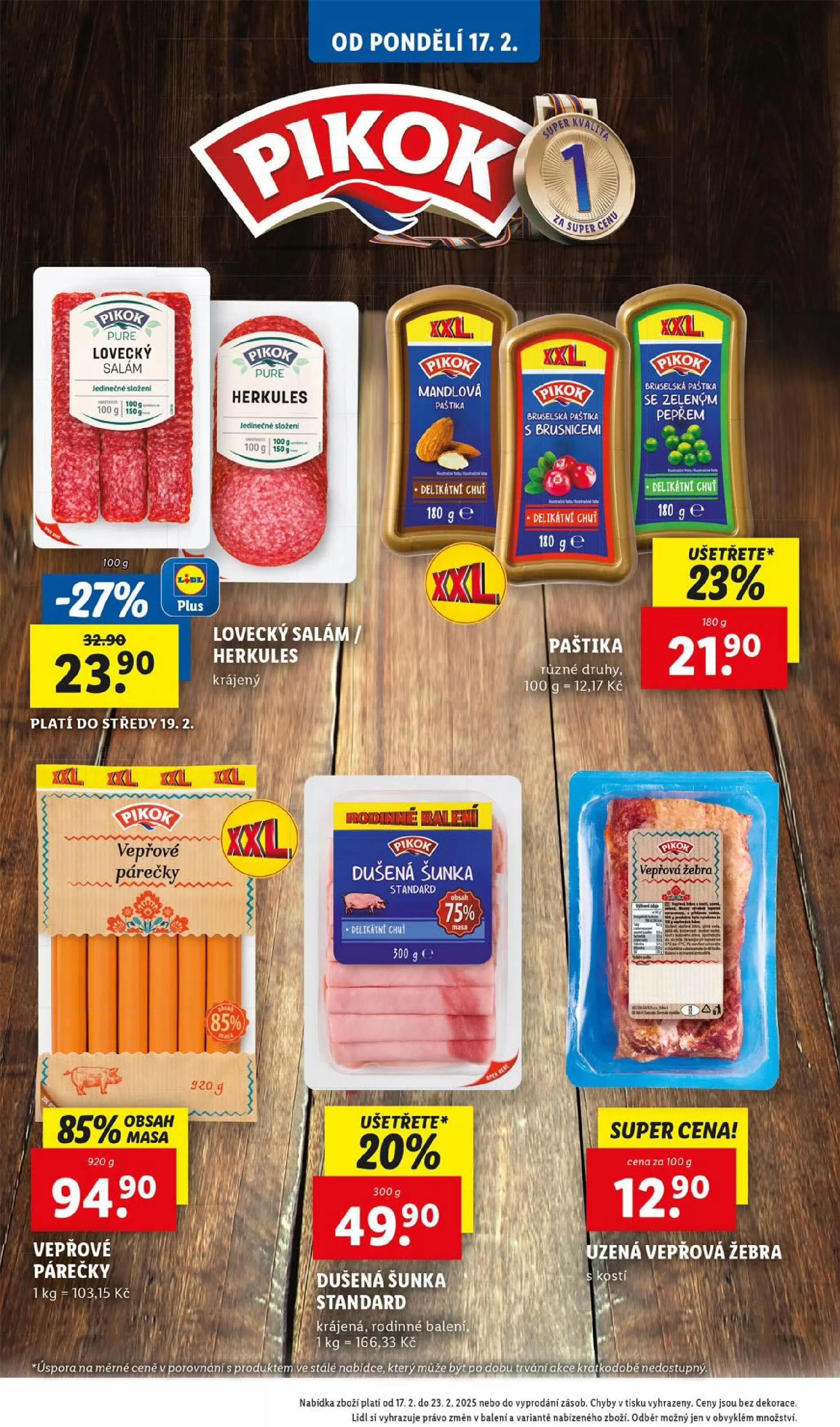 V letáku obchodu Lidl najdete širokou nabídku kvalitních masných výrobků. Mezi nimi vyniká lovecký salám s jedinečným složením, který je k dostání v krájené variantě. Dále si můžete vychutnat vepřová žebra a vepřové párečky, které jsou ideální pro rodinné grilování. Nezapomeňte také na dušenou šunku, která je dostupná v praktickém rodinném balení. Akce platí od 17. do 23. února 2025 nebo do vyprodání zásob. Ušetřete s našimi skvělými cenami!