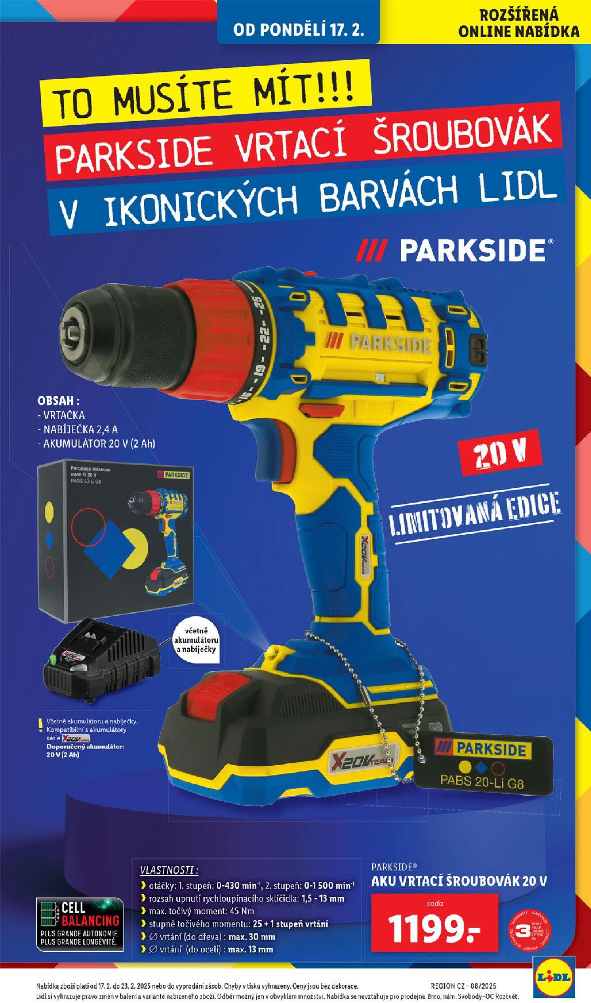 Od pondělí 17.2. si nenechte ujít rozšířenou online nabídku v ikonických barvách Lidl! V nabídce najdete skvělou akci na akumulátorovou vrtačku Parkside, která je vybavena nabíječkou a akumulátorem 20 V (2 Ah).