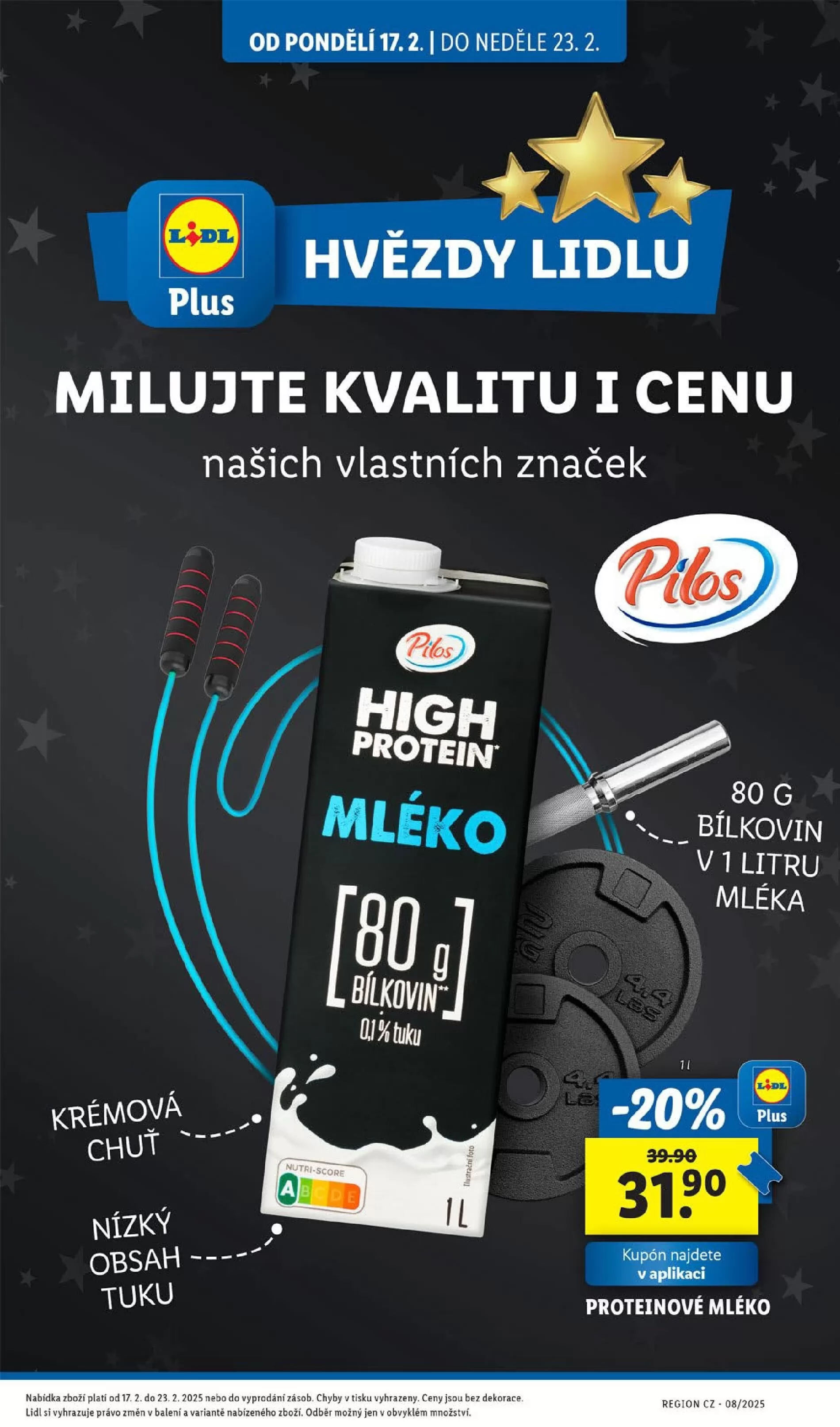 Od pondělí 17. února do neděle 23. února se v Lidlu koná akce "Hvězdy Lidlu". V rámci této nabídky můžete zakoupit kvalitní produkty za skvělé ceny. Mezi nimi se nachází i proteinové mléko s krémovou chutí, které obsahuje 80 g bílkovin v jednom litru. Toto mléko má nízký obsah tuku a je ideální pro všechny, kteří milují kvalitu za rozumnou cenu. Nezapomeňte, že nabídka platí do vyprodání zásob. Pro další slevy využijte kupón v aplikaci Lidl Plus.