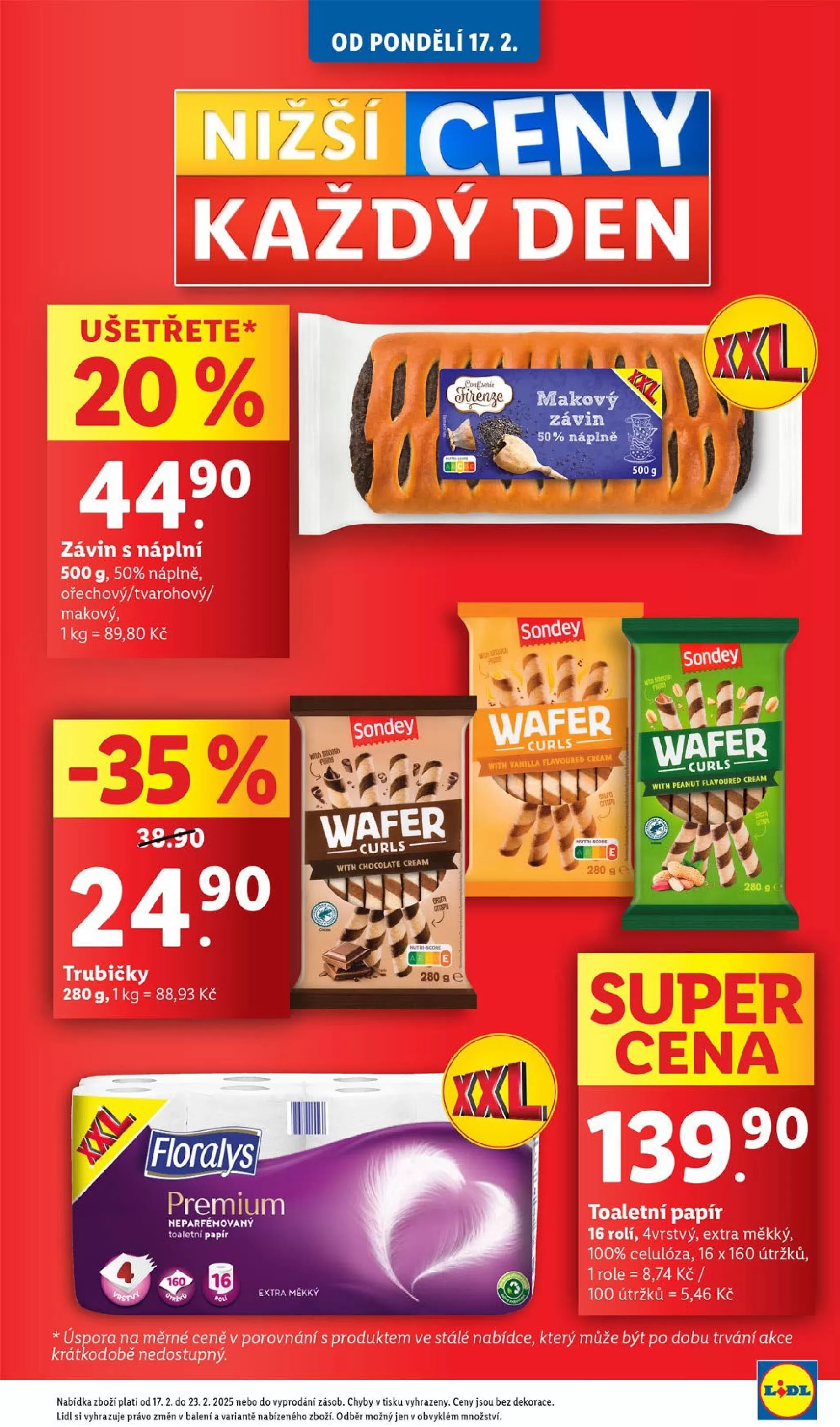 Od pondělí 17.2. si můžete v Lidlu užít skvělé akční nabídky! Ušetřete na lahodném závinu s náplní (500 g, 50% náplně) v příchutích ořechový, tvarohový nebo makový, který je nyní za cenu 89,80 Kč za 1 kg. Dále nabízíme trubičky (280 g) za skvělou cenu 88,93 Kč za 1 kg.