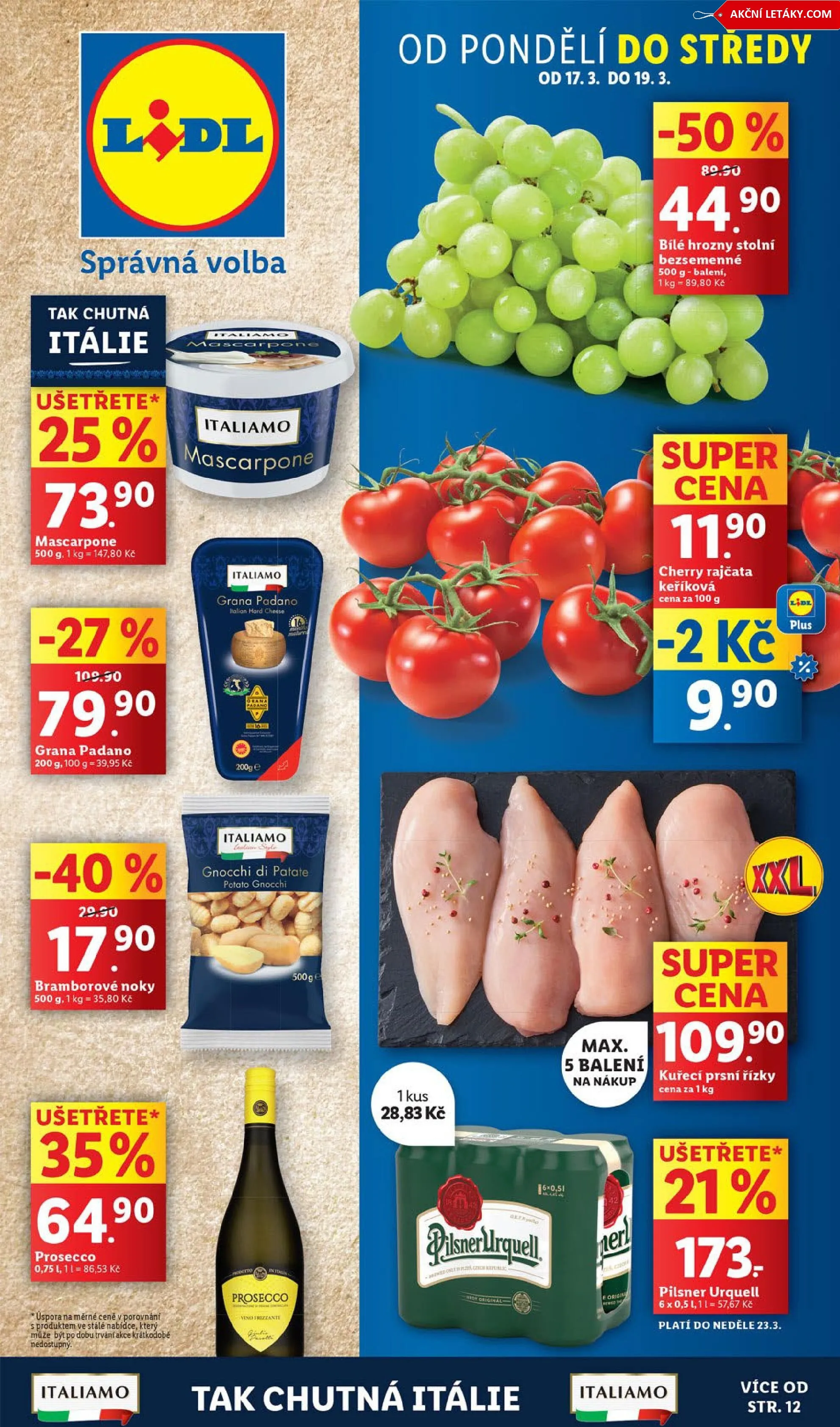 V letáku obchodu Lidl najdete skvělé produkty, které potěší vaše chuťové pohárky. Od pondělí do středy, od 17.3. do 19.3., můžete ušetřit na italských specialitách. Například mascarpone 500 g za 79,90 Kč a grana padano za 109,90 Kč.