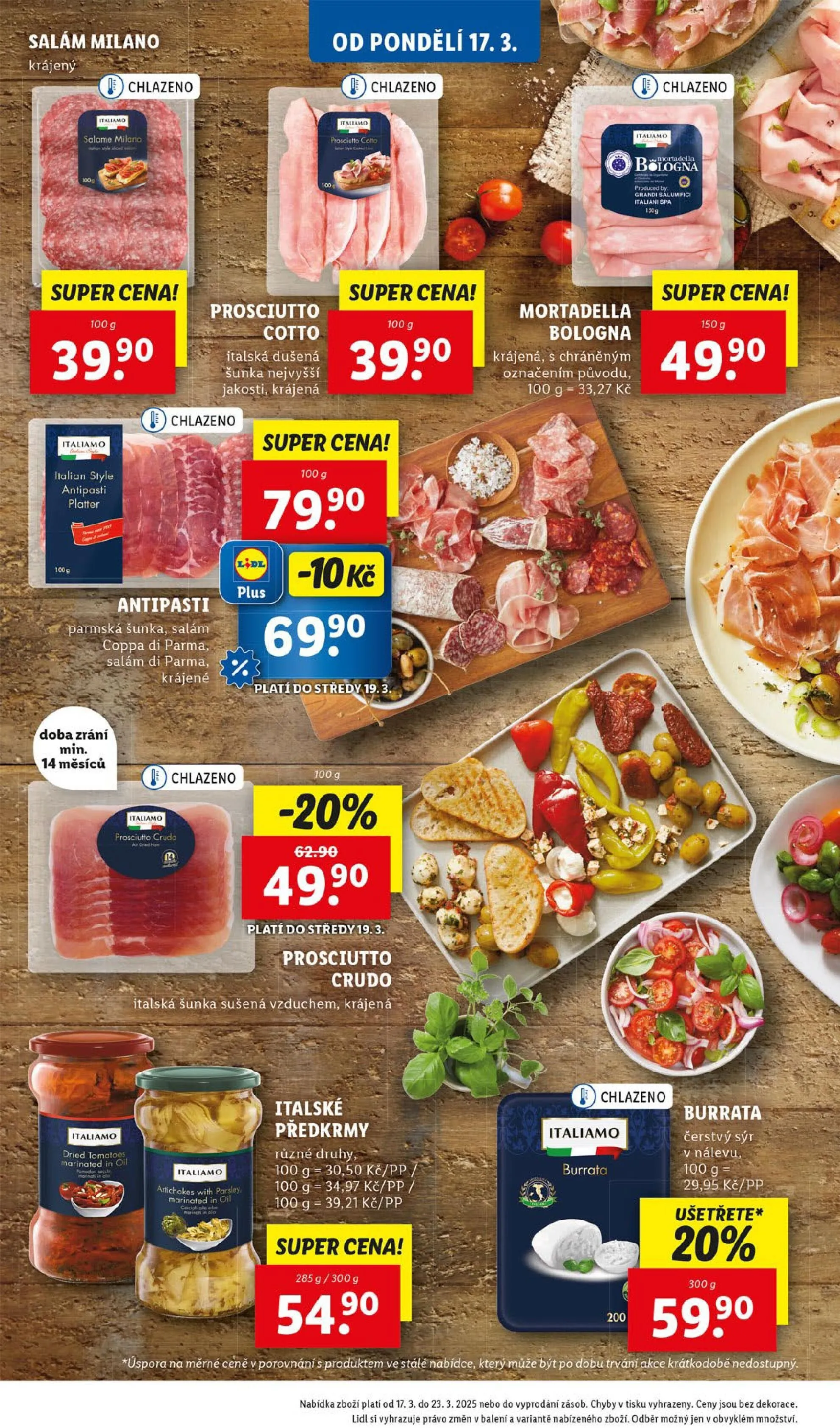 V letáku obchodu Lidl najdete skvělou nabídku chlazených masných výrobků. Mezi nimi je krájený salám Milano za super cenu 39,00 Kč, italská dušená šunka prosciutto cotto, také za 39,00 Kč, a krájená mortadella Bologna s chráněným označením původu za 49,00 Kč. Dále se můžete těšit na antipasti, které zahrnují parmskou šunku a salám „coppa di parma“ s dobou zrání 14 měsíců, opět za výhodnou cenu. Nezapomeňte také na sušenou vzduchem italskou šunku prosciutto crudo a různé druhy italských předkrmů. A pro milovníky sýrů je v nabídce čerstvý sýr burrata za 59,00 Kč. Tato akční nabídka platí od 17.3. do 23.3.2025, nebo do vyprodání zásob.