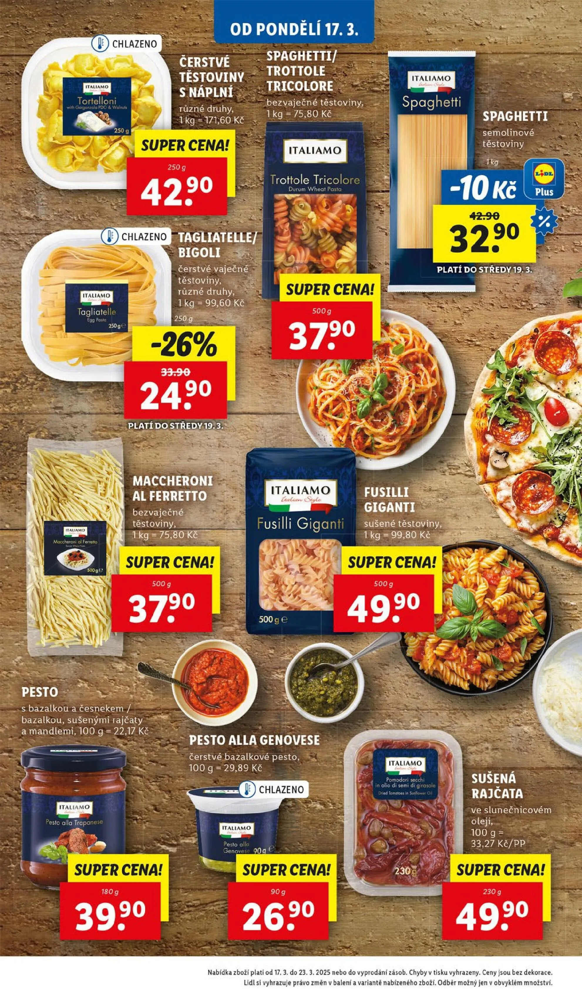 V letáku obchodu Lidl najdete širokou nabídku čerstvých a chlazených těstovin. Mezi nimi se objevují tagliatelle, bigoli a bezvaječné spaghetti a trottole tricolore, které jsou k dispozici za super ceny. Například 1 kg tagliatelle je za 171,60 Kč a bigoli za 99,60 Kč.