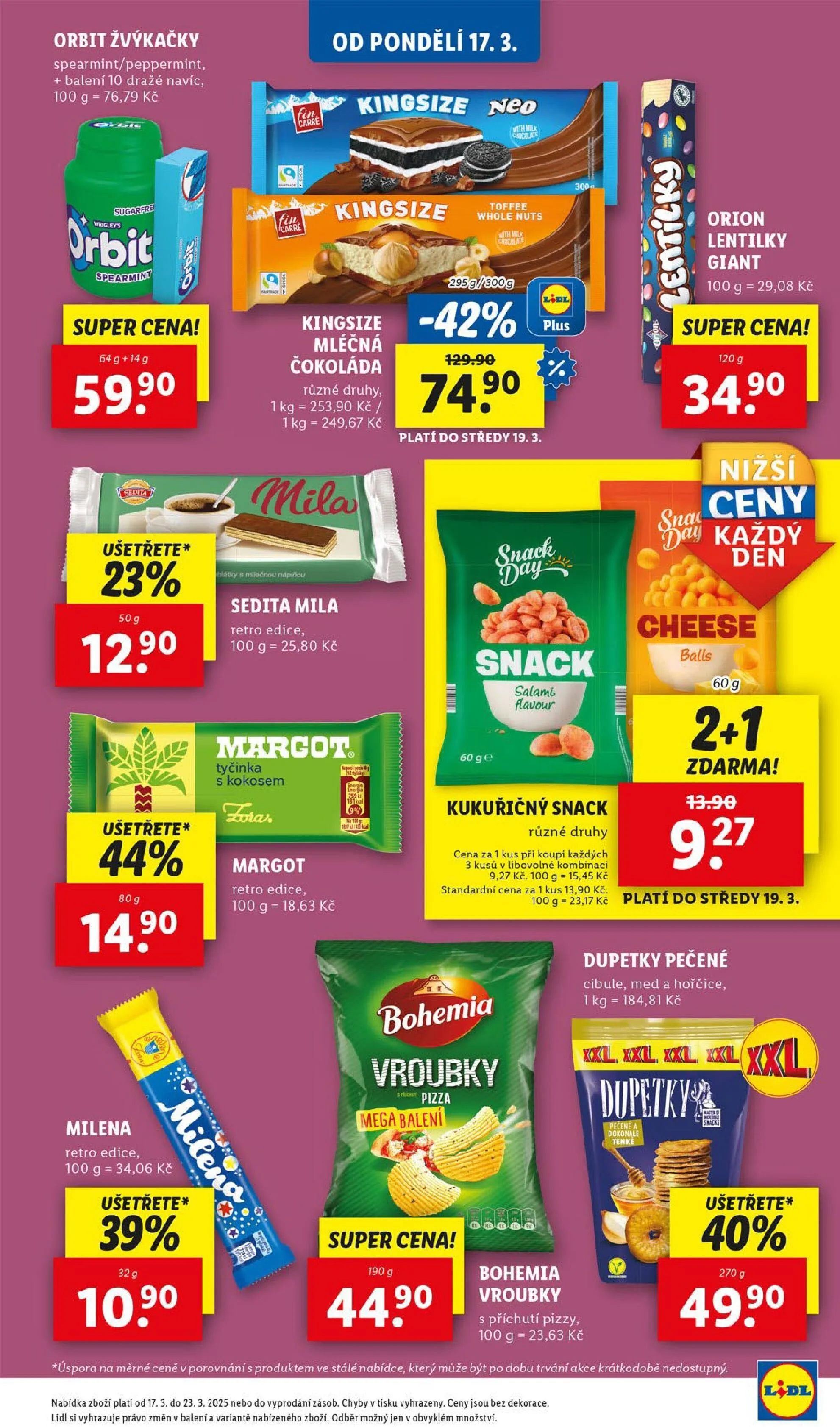 V letáku obchodu Lidl najdete širokou nabídku produktů za skvělé ceny! Mezi nimi jsou žvýkačky Orbit v příchutích spearmint a peppermint, které nyní obsahují 10 dražé navíc. Dále si můžete vychutnat retro edici čokolád Sedita Mila a Margot, nebo lentilky Orion Giant.
