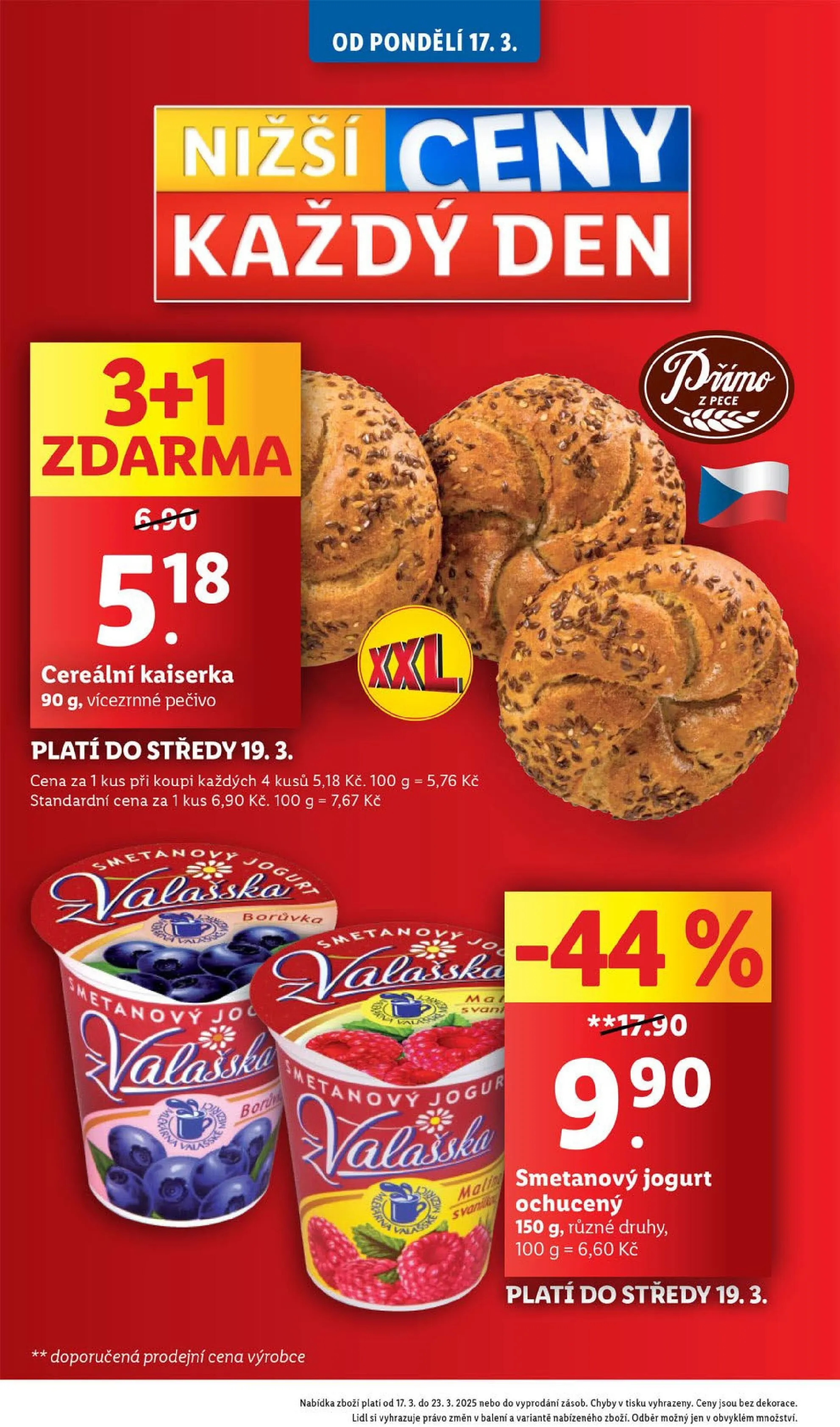 Od pondělí 17.3. si můžete v obchodě Lidl zakoupit výhodné produkty! Mezi nimi najdete vícezrnné cereální kaiserky o hmotnosti 90 g za skvělou cenu 6,90 Kč. Při koupi čtyř kusů je cena za jeden pouze 5,18 Kč.