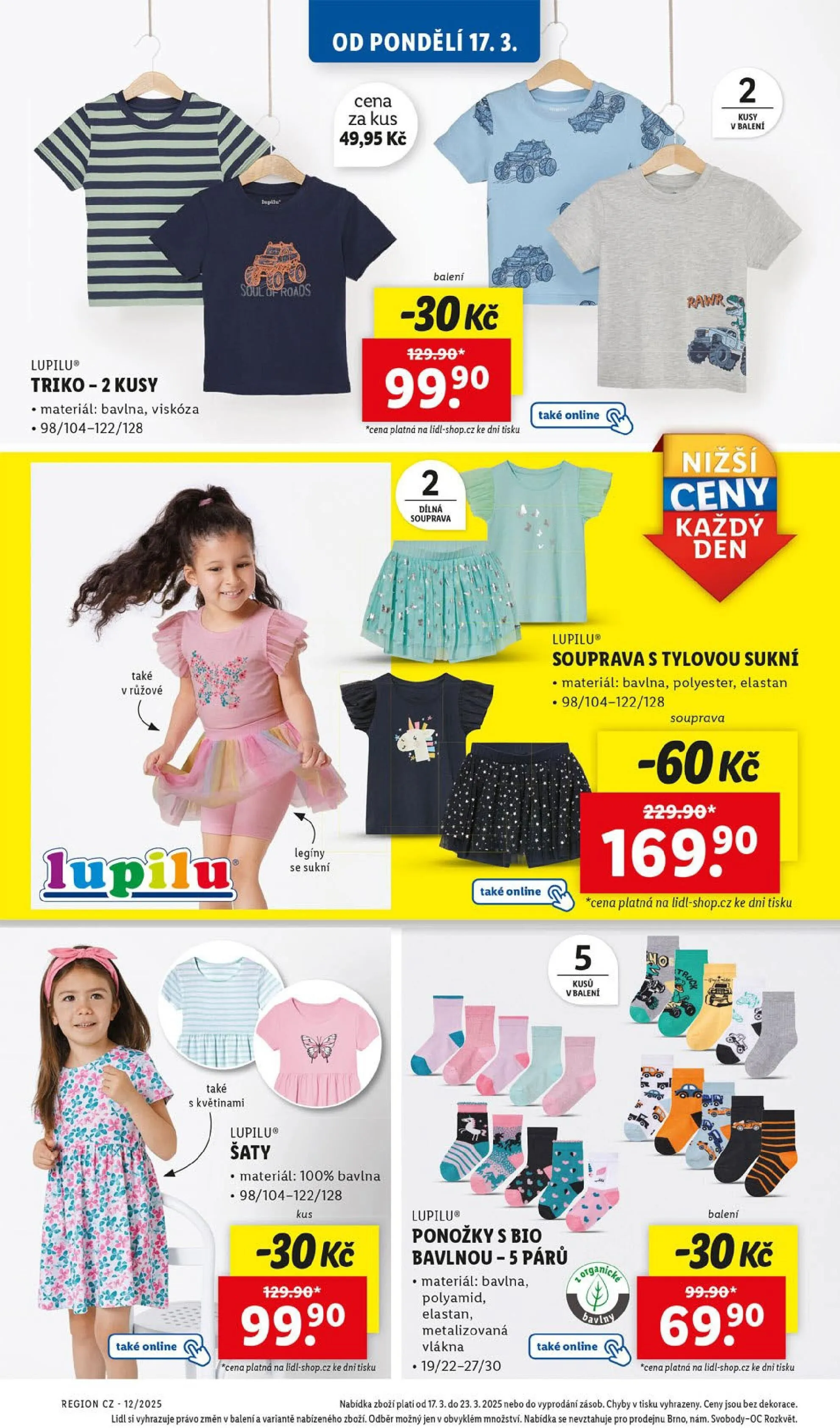 V letáku obchodu Lidl najdete skvélé produkty značky Lupilu, které potěší nejen děti, ale i jejich rodiče. Od pondělí 17.3. si můžete pořídit trika ve dvojbalení za cenu 49,95 Kč za kus, vyrobená z příjemné směsi bavlny a viskózy. Dále nabízíme soupravu legín se sukní, která je k dostání za 60 Kč, a šaty s květinovým vzorem za 99 Kč, vyrobené ze 100% bavlny.
