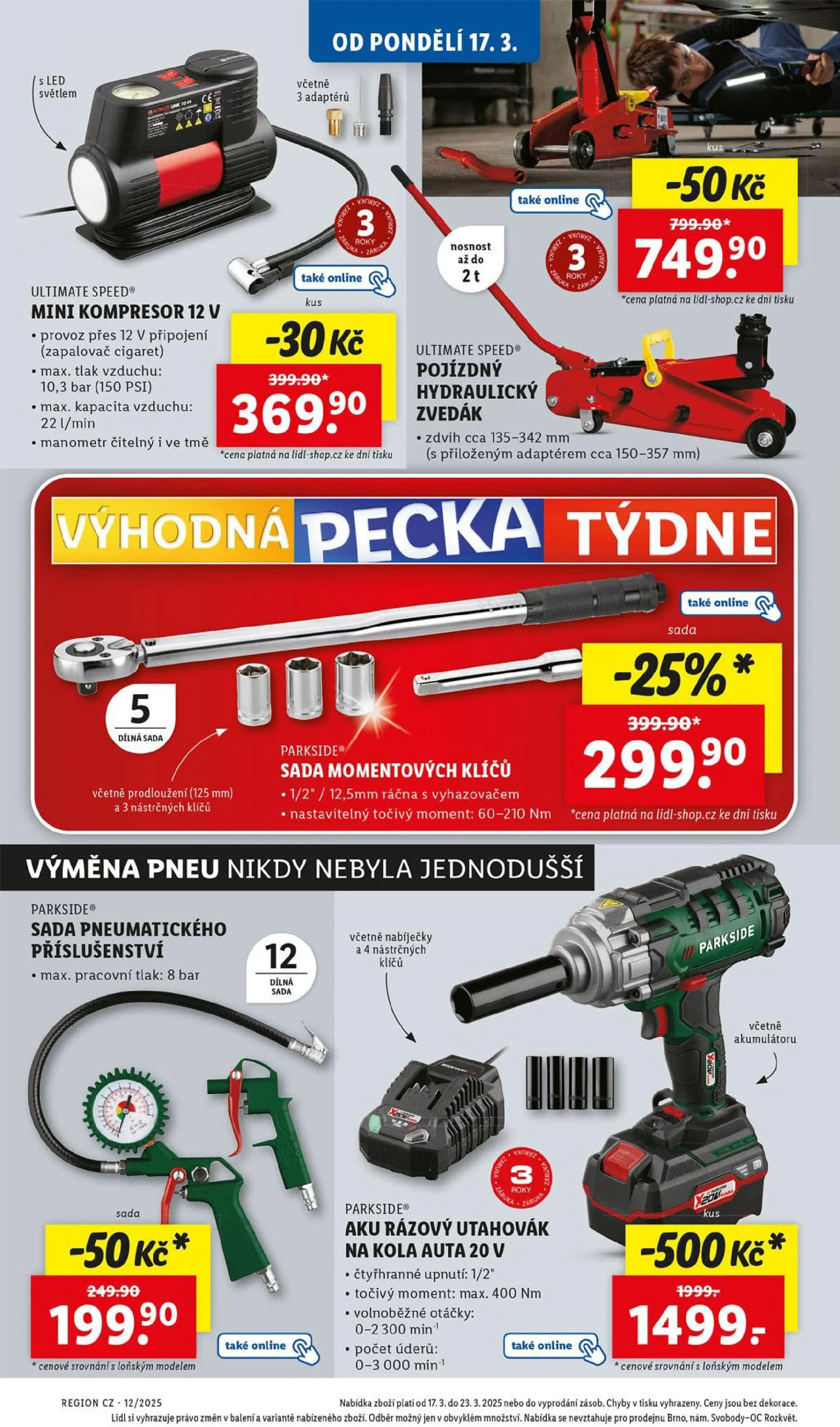 Od pondělí 17.3. v obchodě Lidl najdete skvělé produkty, které vám usnadní práci a zlepší vaše zážitky. Mezi nimi je mini kompresor Ultimate Speed s provozem přes 12 V připojení, maximálním tlakem vzduchu 10,3 bar a čitelným manometrem i ve tmě. Dále nabízíme pojízdný hydraulický zvedák s výškou zdvihu 135-342 mm a praktickou 5dílnou sadu momentových klíčů Parkside, která usnadní výměnu pneumatik.