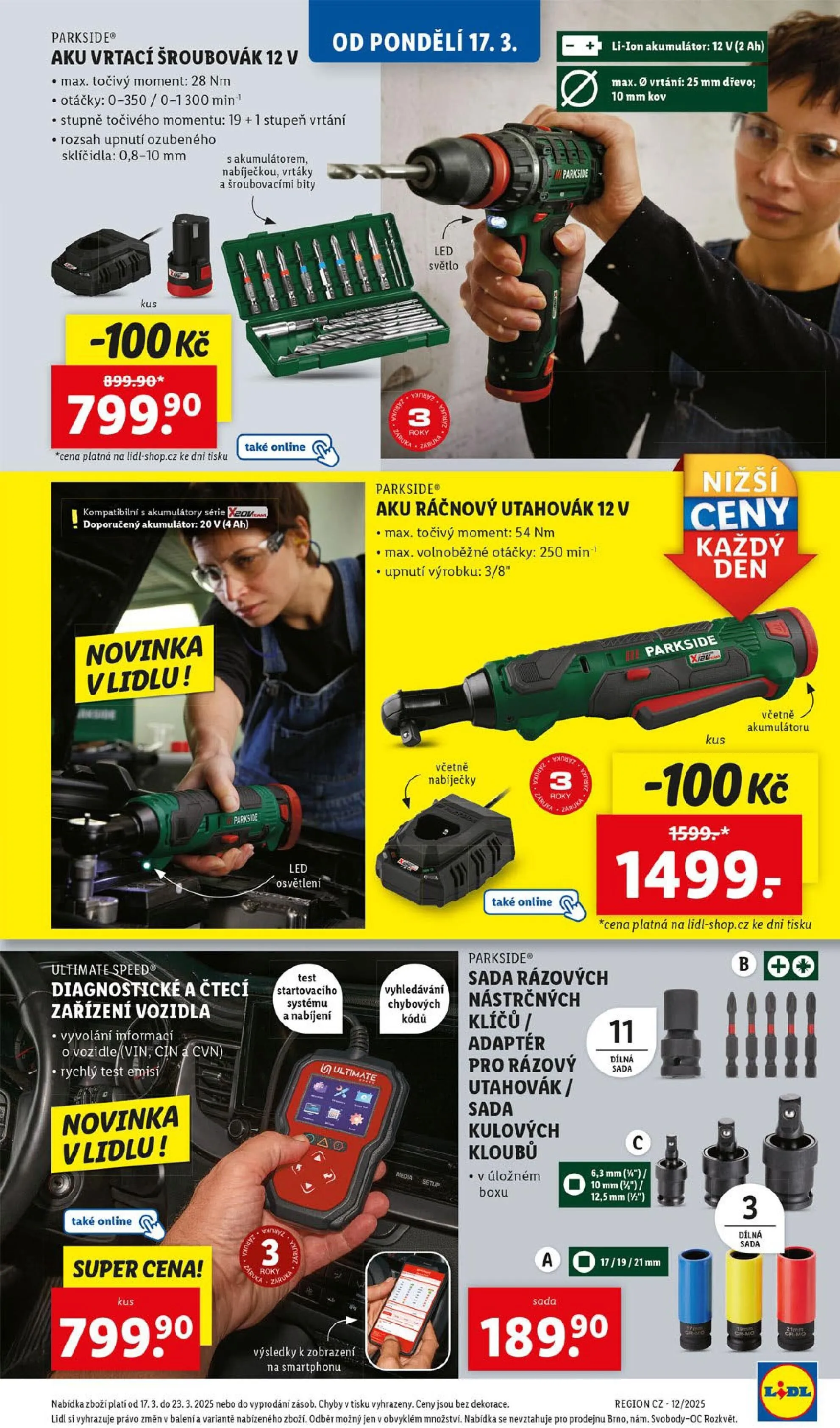 V letáku obchodu Lidl najdete skvělé produkty pro kutily a domácí údržbu. Od pondělí 17.3. je k dispozici aku vrtací šroubovák Parkside s maximálním točivým momentem 28 Nm a otáčkami až 1 300 min-1. Tento šroubovák je dodáván s akumulátorem, nabíječkou, vrtáky a šroubovacími bity za cenu 799 Kč.