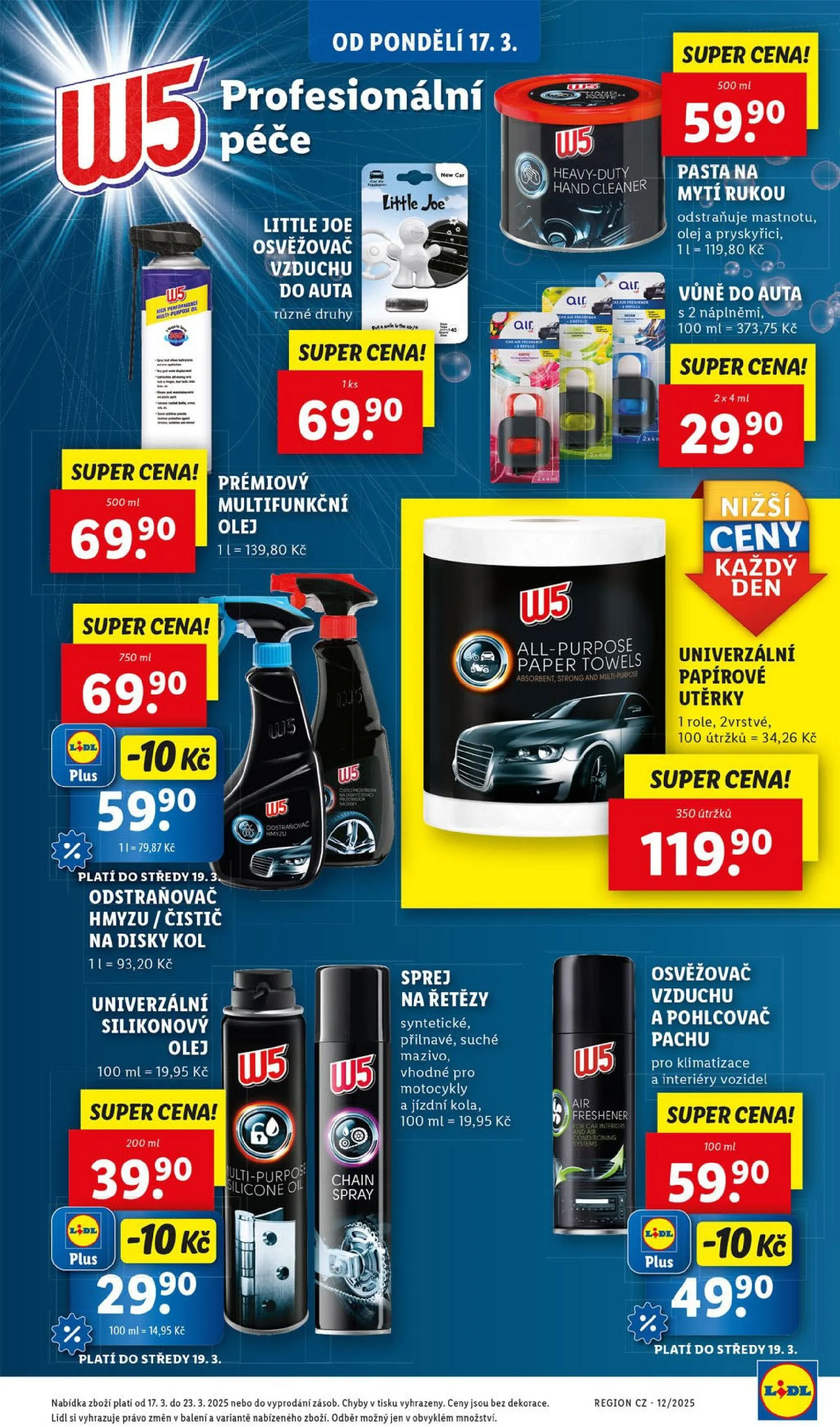 Od pondělí 17.3. v Lidlu najdete širokou nabídku profesionální péče o domácnost a auto. Mezi produkty se objevují osvěžovače vzduchu do auta značky Little Joe, které jsou k dispozici za super cenu 69 Kč. Dále nabízíme heavy-duty čističe rukou, které efektivně odstraňují mastnotu a olej, a to za 119,80 Kč.